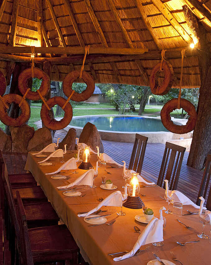 Deck direkt am Flussufer, Übergang zum Bar- und Loungebereich. Der Hauptbereich ist sehr offen angelegt und verfügt lediglich über ein Strohdach. Über eine kleine Brücke, die eine Lagune überspannt, gelangt man in den zweiten Teil des Camps. Swimmingpool, Deck und überdachter Essbereich, Bibliothek.