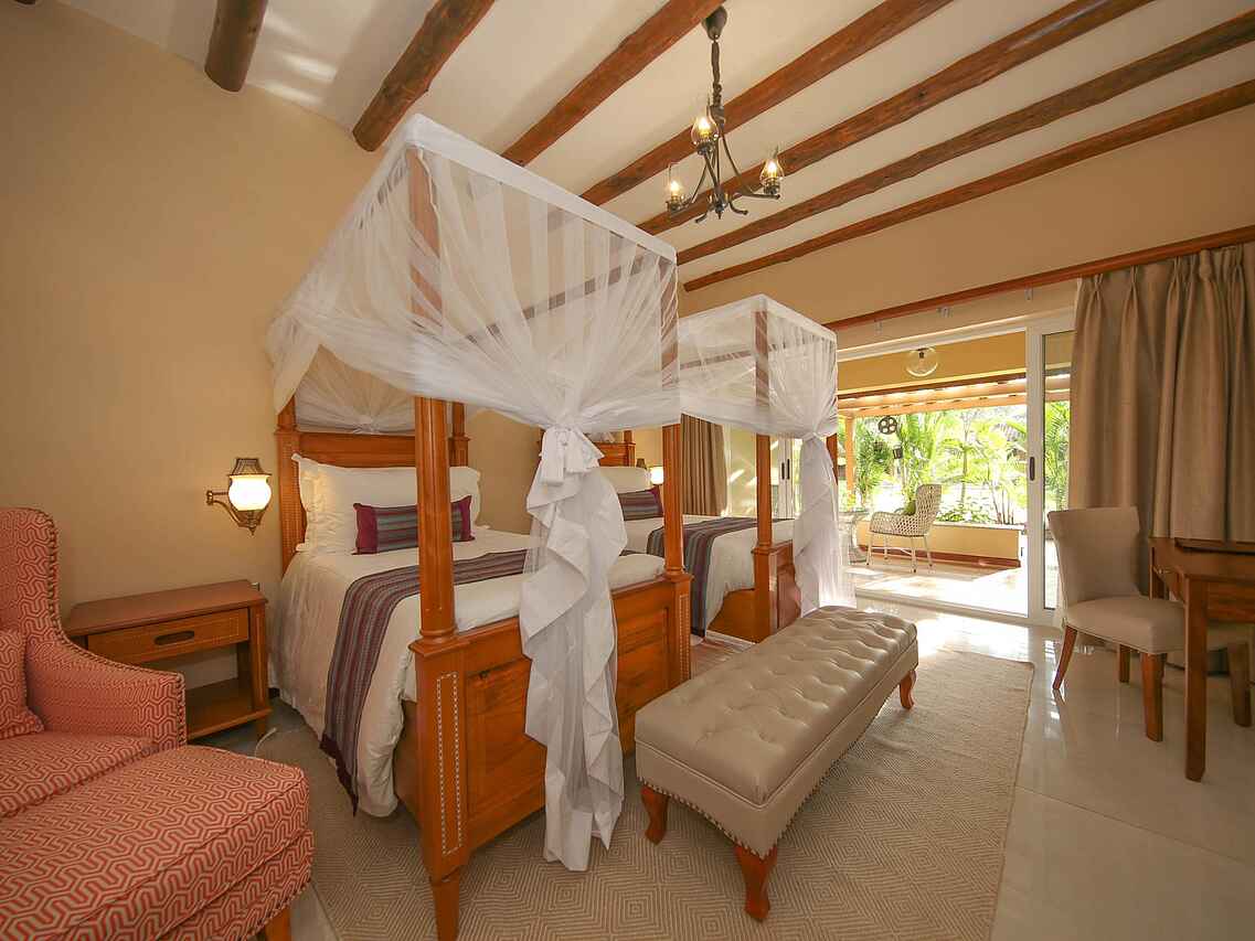 Das Hotel verfügt über 10 Zimmer und 5 Apartments. In den komfortablen Zimmern kann man zwischen einem Doppelbett oder zwei Einzelbetten wählen, die jeweils von einem Moskitonetz umgeben sind. Alle Zimmer sind geräumig, klimatisiert und bieten Zugang zu einem Balkon oder einer Terrasse, von denen man einen malerischen Blick auf den Swimmingpool und die wohlgepflegten Grünflächen genießt.