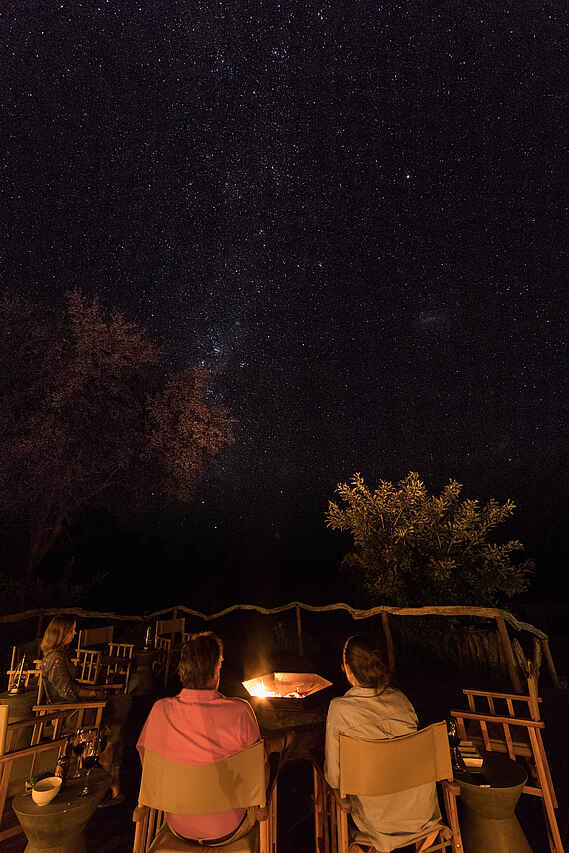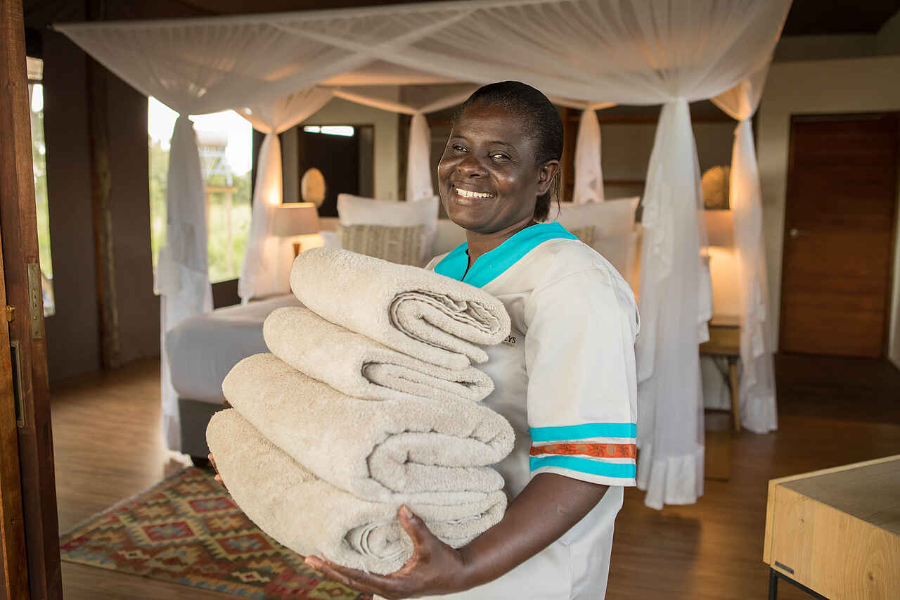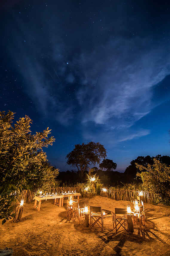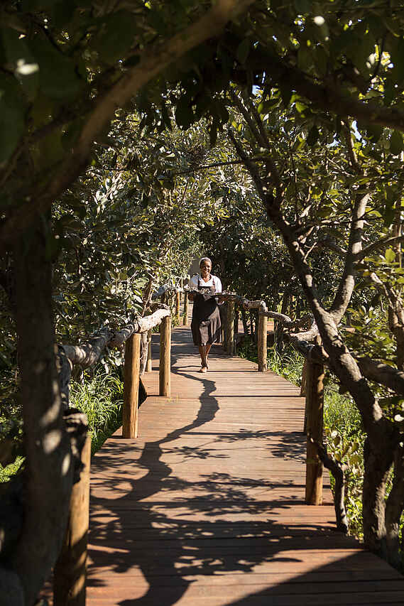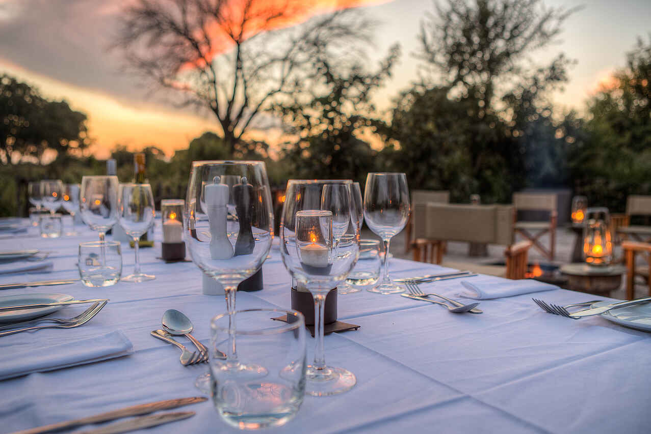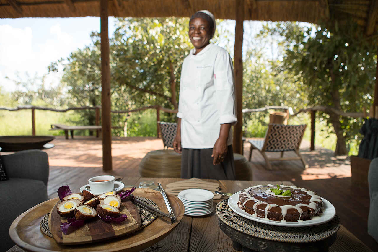 All Inclusive, Kontinentales Frühstück gemeinsam im Hauptgebäude oder an der Boma, herzhafter (Bush-) Brunch, High Tea, Snacks und Getränke an der Feuerstelle und Bar, kleines Abendessen mit drei Gängen. Englische Küche mit lokalem Twist. Lokale Delikatessen nach Verfügbarkeit.