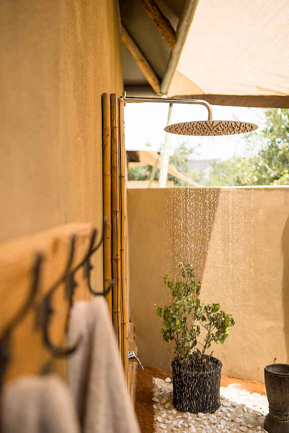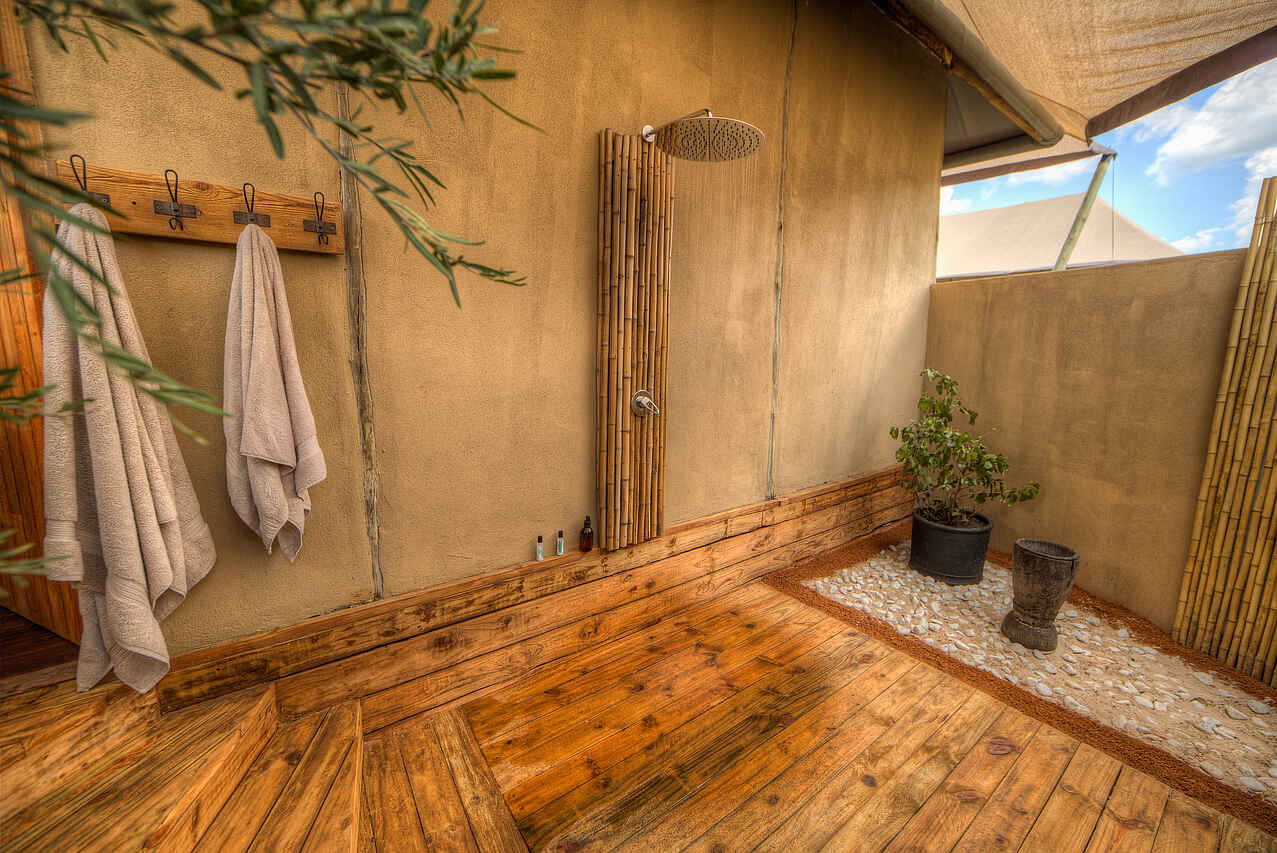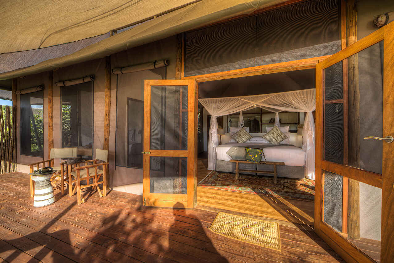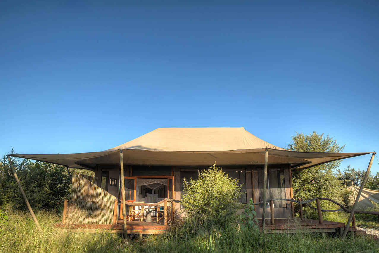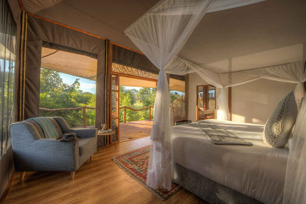 7 Zelte plus 3 Familienunterkünfte erhöht auf ca. 2m hohen Podesten mit Innen- und Außendusche, Holzelementen und -boden, kleiner Terrasse mit Sitzgelegenheit und Panoramablick auf den Fluss und die umliegende Buschlandschaft. Zelte sind etwas weiter auseinander gelegen, sind mit Holzstegen verbunden und bieten Sichtschutz und Privatsphäre. Wäscheservice, Badezimmer mit separatem Waschtisch mit Doppelwaschbecken im Wohnbereich, Schreibstube, keine Klimaanlage aber offene, luftige Architektur und Deckenventilatoren, Zeltwände lassen sich zum Schutz komplett schließen – Mückennetze an den Fenstern vorhanden. KingSize Betten, separates Kinderzimmer mit zwei Einzelbetten im Familienzelt. Alle Betten sind mit Mückennetzen ausgestattet. Neueröffnung Februar 2018
