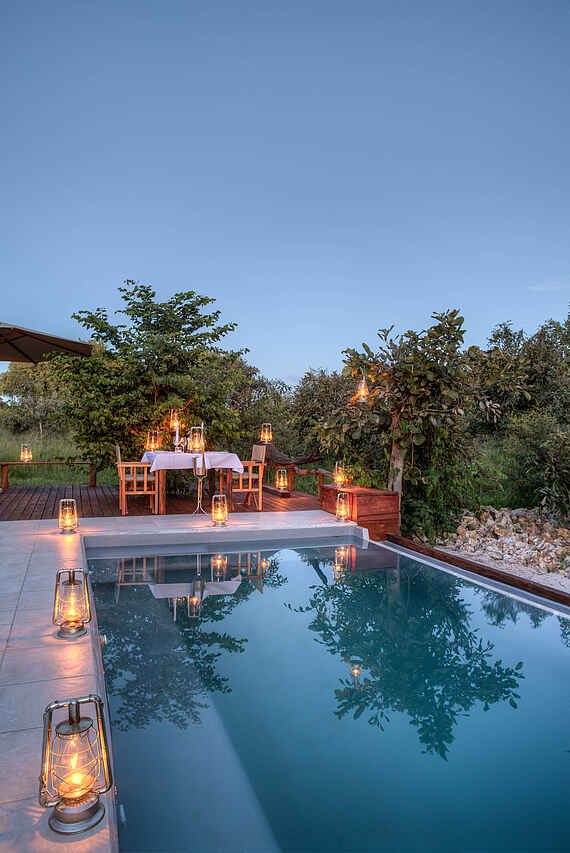 Zwei Einstöckige, halboffene, auf Podesten erhöhte, reetgedeckte Hauptgebäude im Kolonialstil. Terrasse mit Feuerstelle, ebenerdige Boma am Flussufer, Speisesaal, Bar, Loungebereich, Plunge Pool mit beschatteten Liegemöglichkeiten, kein W-Lan. Die Zelte und Hauptgebäude sind untereinander mit Holzstegen verbunden.