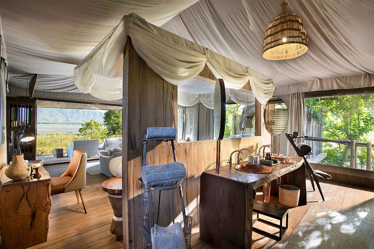 Die Gäste schlafen in einem von 6 Gästechalets jeweils mit großen Doppelbetten unter Moskitonetzen. Die Chalets haben Blick auf den Sambesi. Vor den Chalets ein großes Deck mit privatem Plunge Pool und seitlich versetzt einer open air Lounge. Im Chalet erreicht man das private Bad mit Doppelwaschtisch, WC, Dusche sowie fließend Kalt- und Warmwasser über drei Stufen.