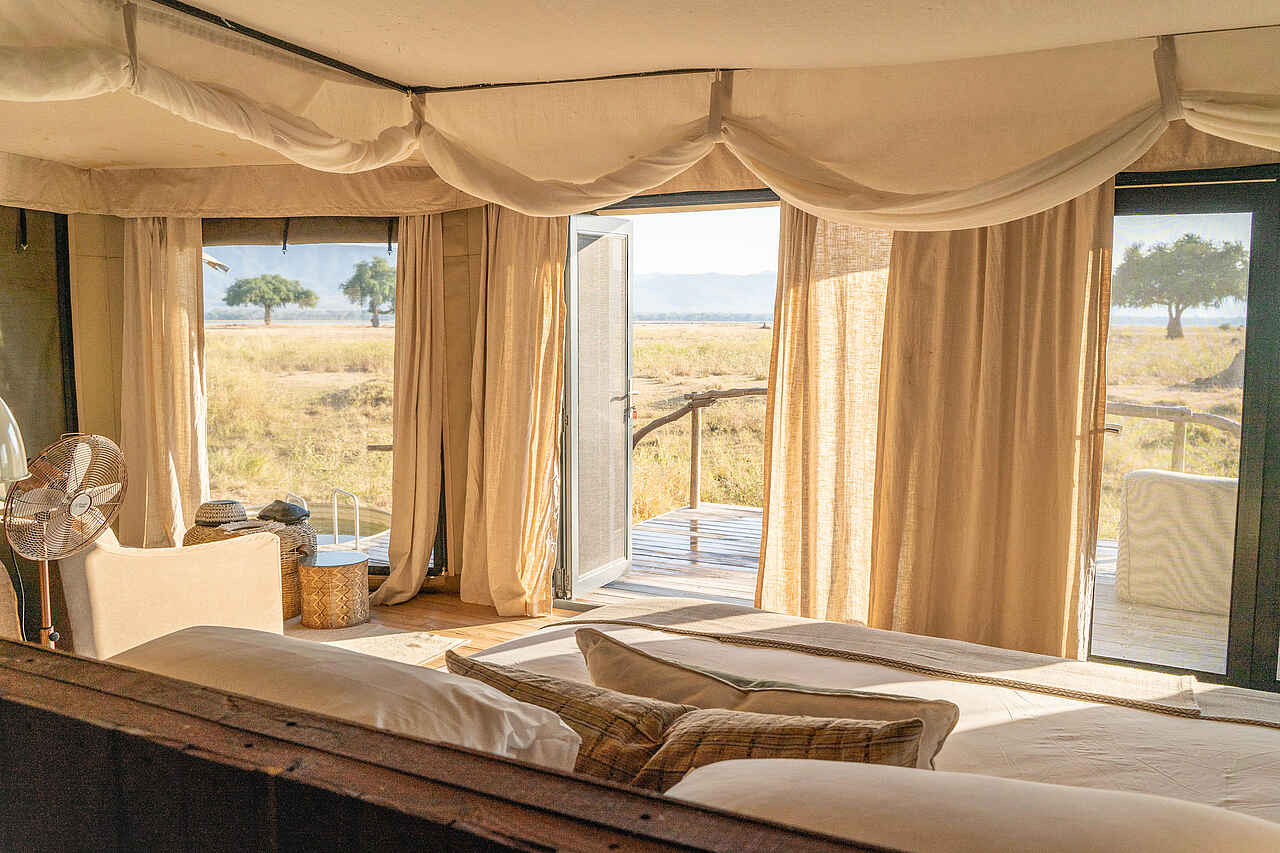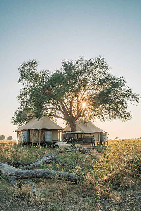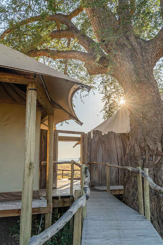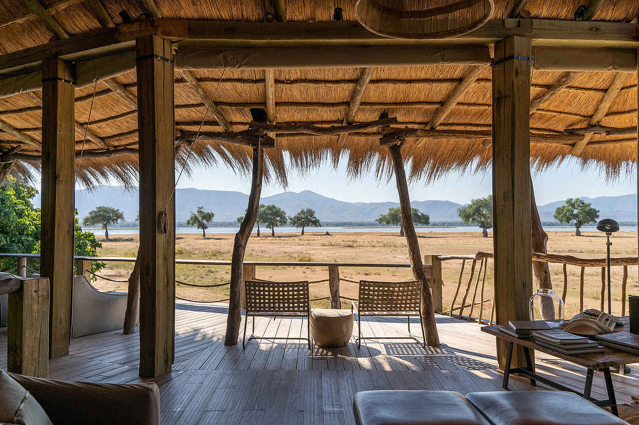 Das Nyamatusi Mahogany Camp liegt in einer privaten Konzession im Mana Pools Nationalpark im Westen Simbabwes direkt an den Ufern des Sambesi. Große Mahagonibäume spenden Schatten. Der Blick schweift frei über die Flußlandschaft zu den Bergen am Horizont.