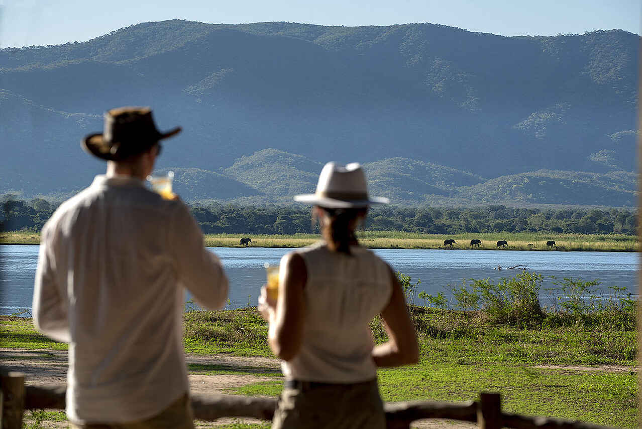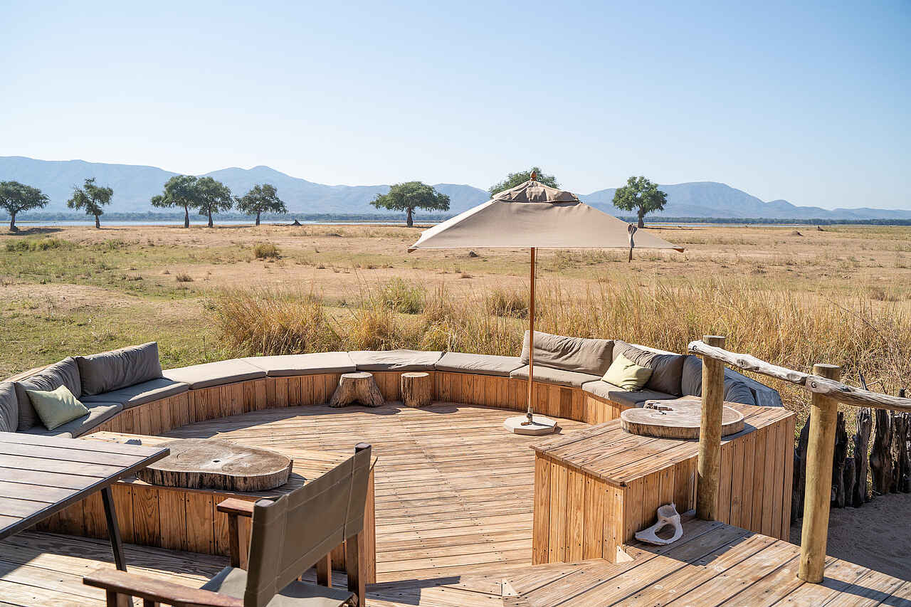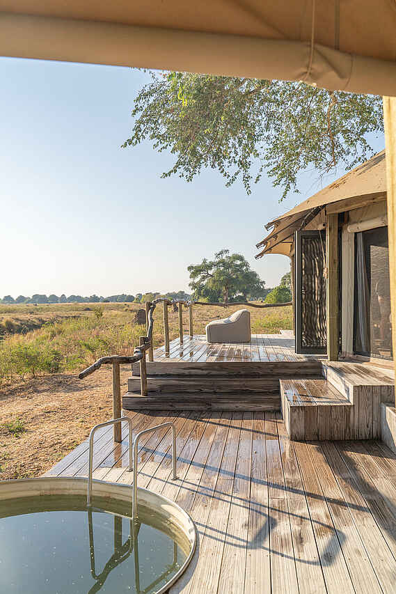 Die Ausblicke auf den Fluss und die dahinterliegenden Berge am Horizont sind vom Camp aus spektakulär. Besonders gut lässt sich die unberührte Natur vom doppelstöckigen Hauptbereich beobachten. Verteilt auf zwei Etagen findet man dort im oberen Bereich eine Lounge mit Bar und den Essbereich. Im unteren Bereich liegen auf erhöhten Aussichtsdecks der Pool mit Terrasse und die Boma, wo die abendlichen Drinks an der Feuerstelle immer besonders gut schmecken.
