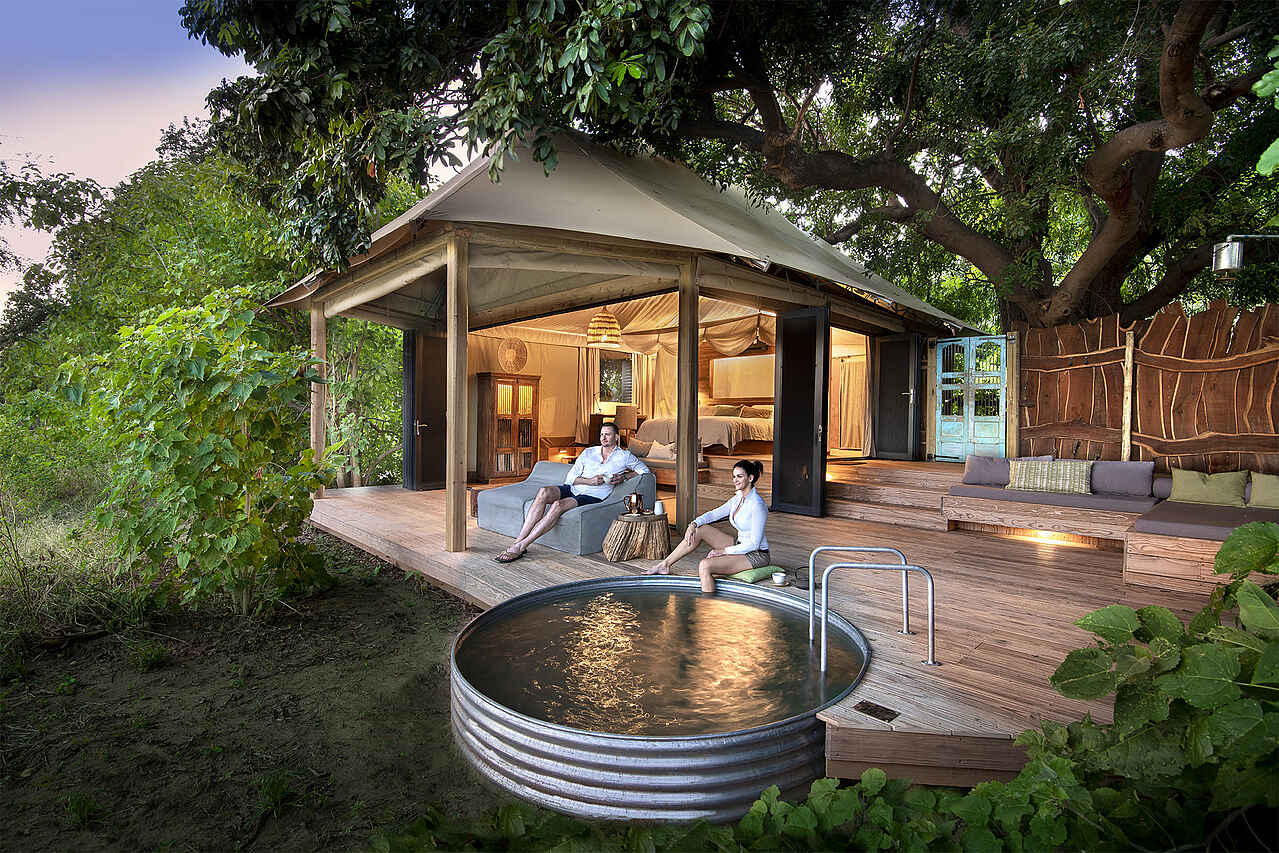 Die Zelte sind großzügig gestaltet und luxuriös ausgestattet. Die einzelnen Einheiten liegen weit voneinander entfernt, was absolute Privatspähre und Ruhe verspricht. Der gemütliche Aufenthaltsraum geht fließend in den großen Terrassenbereich mit bequemen Sitzgelegenheiten und privatem Plungepool über. Im Schlafzimmer zieht das große Doppelbett mit angedeutetem Himmeldach und hochwertigen Stoffen alle Blicke auf sich.