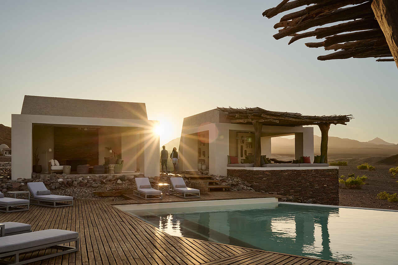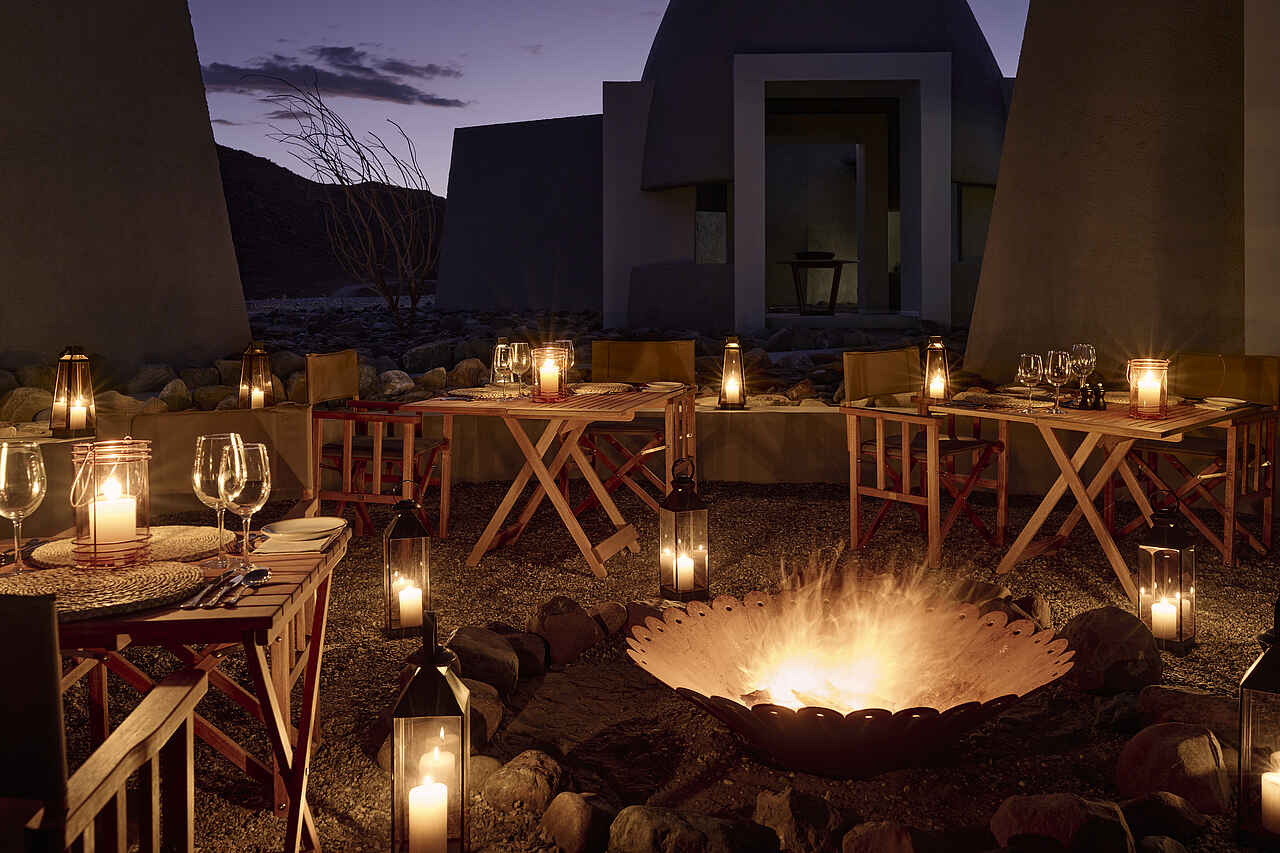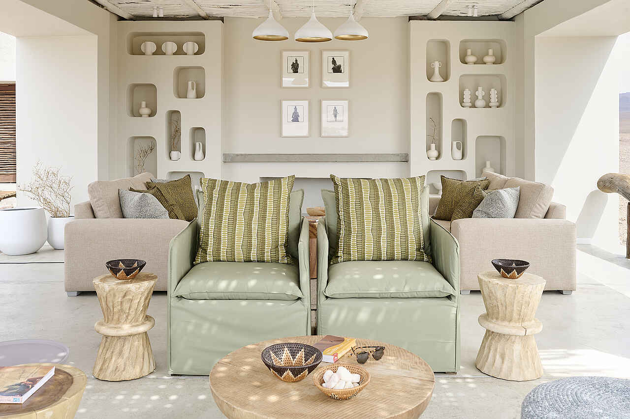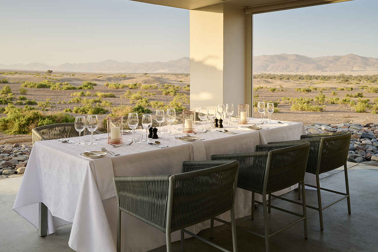 Die offenen Wände der Hauptlounge und des Speisebereichs bieten den Gästen spektakuläre Ausblicke und schaffen eine friedliche Atmosphäre, ideal, um nach einem abenteuerlichen Tag ein köstliches Essen und edlen Wein zu genießen. Gemütliche Sitzgelegenheiten und ein Kamin in der Lounge sorgen für wohlige Wärme in den kühlen Wüstennächten. Der Infinity-Pool bietet ein scheinbar endloses Panorama über die Berge am Horizont, und in der traditionellen Boma kann man sich am Abend um ein Feuer versammeln, um Gespräche zu führen oder den Sternenhimmel zu betrachten.