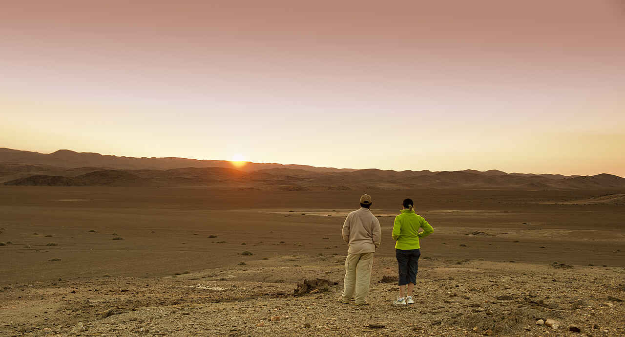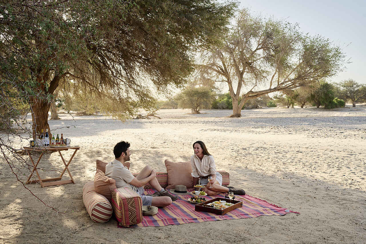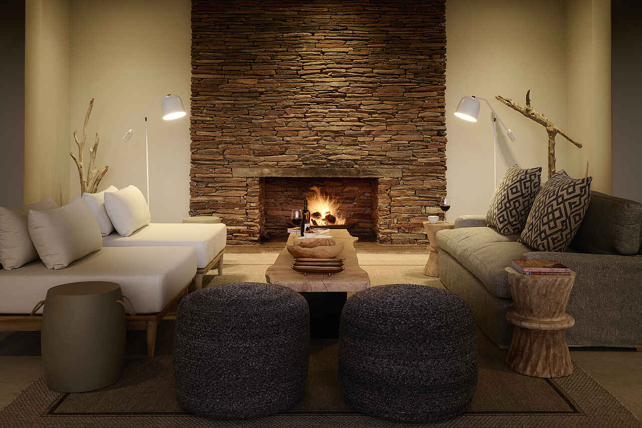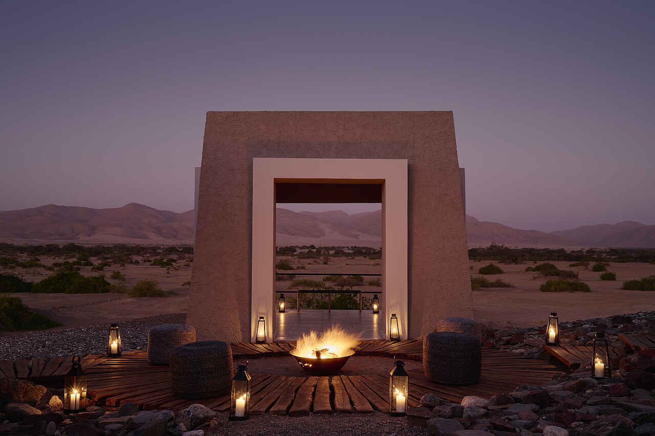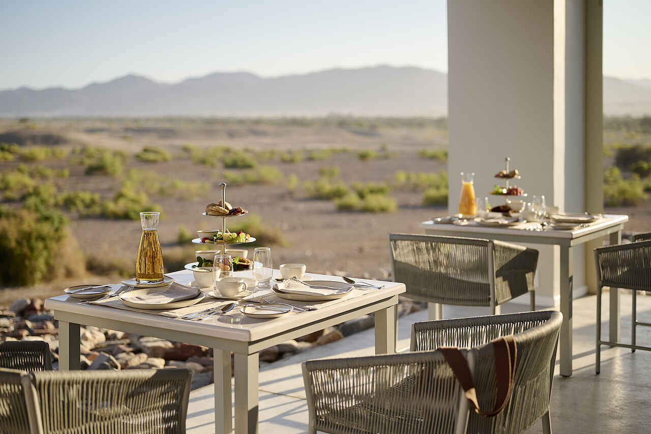 Die offenen Wände der Hauptlounge und des Speisebereichs bieten den Gästen spektakuläre Ausblicke und schaffen eine friedliche Atmosphäre, ideal, um nach einem abenteuerlichen Tag ein köstliches Essen und edlen Wein zu genießen. Gemütliche Sitzgelegenheiten und ein Kamin in der Lounge sorgen für wohlige Wärme in den kühlen Wüstennächten. Der Infinity-Pool bietet ein scheinbar endloses Panorama über die Berge am Horizont, und in der traditionellen Boma kann man sich am Abend um ein Feuer versammeln, um Gespräche zu führen oder den Sternenhimmel zu betrachten.