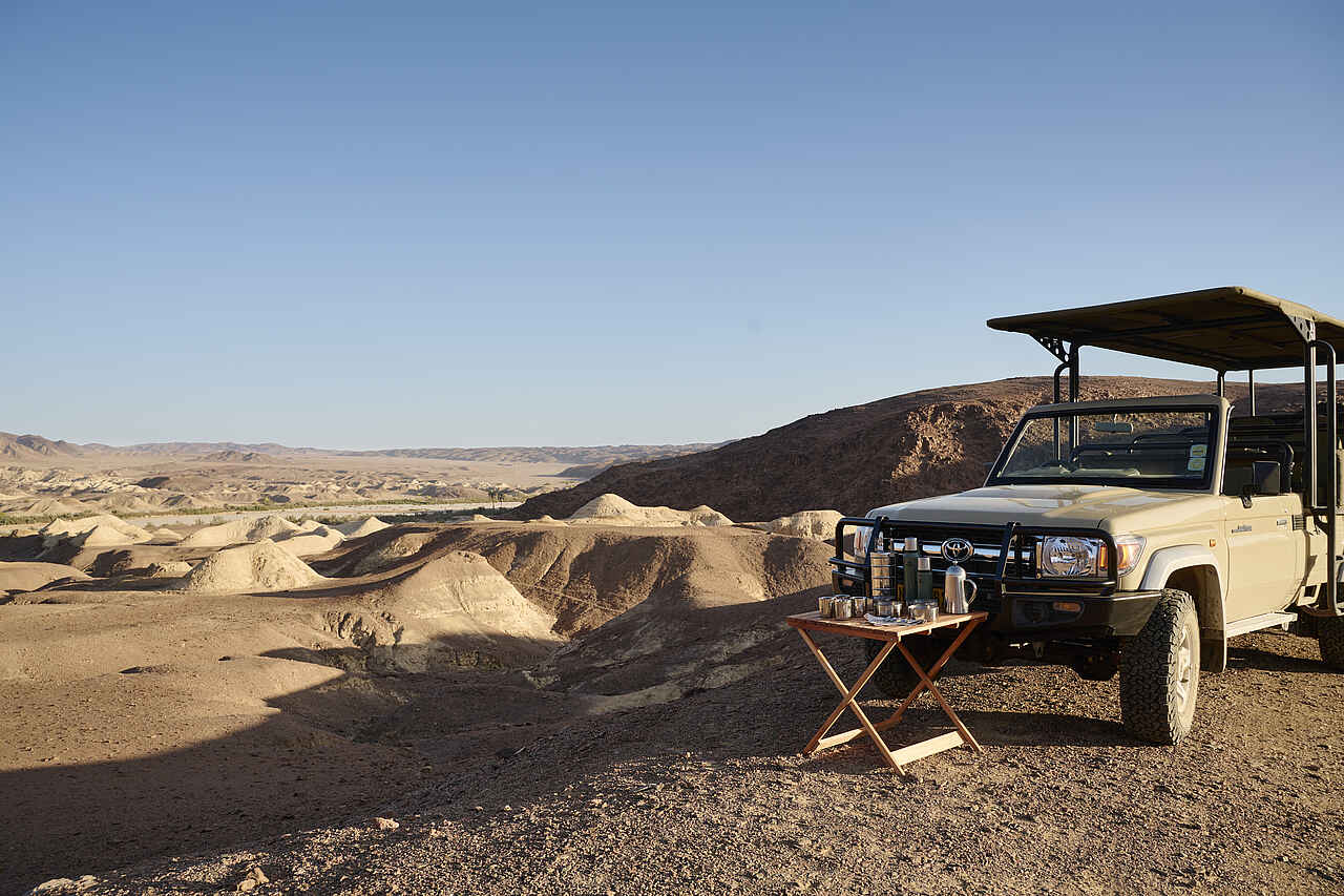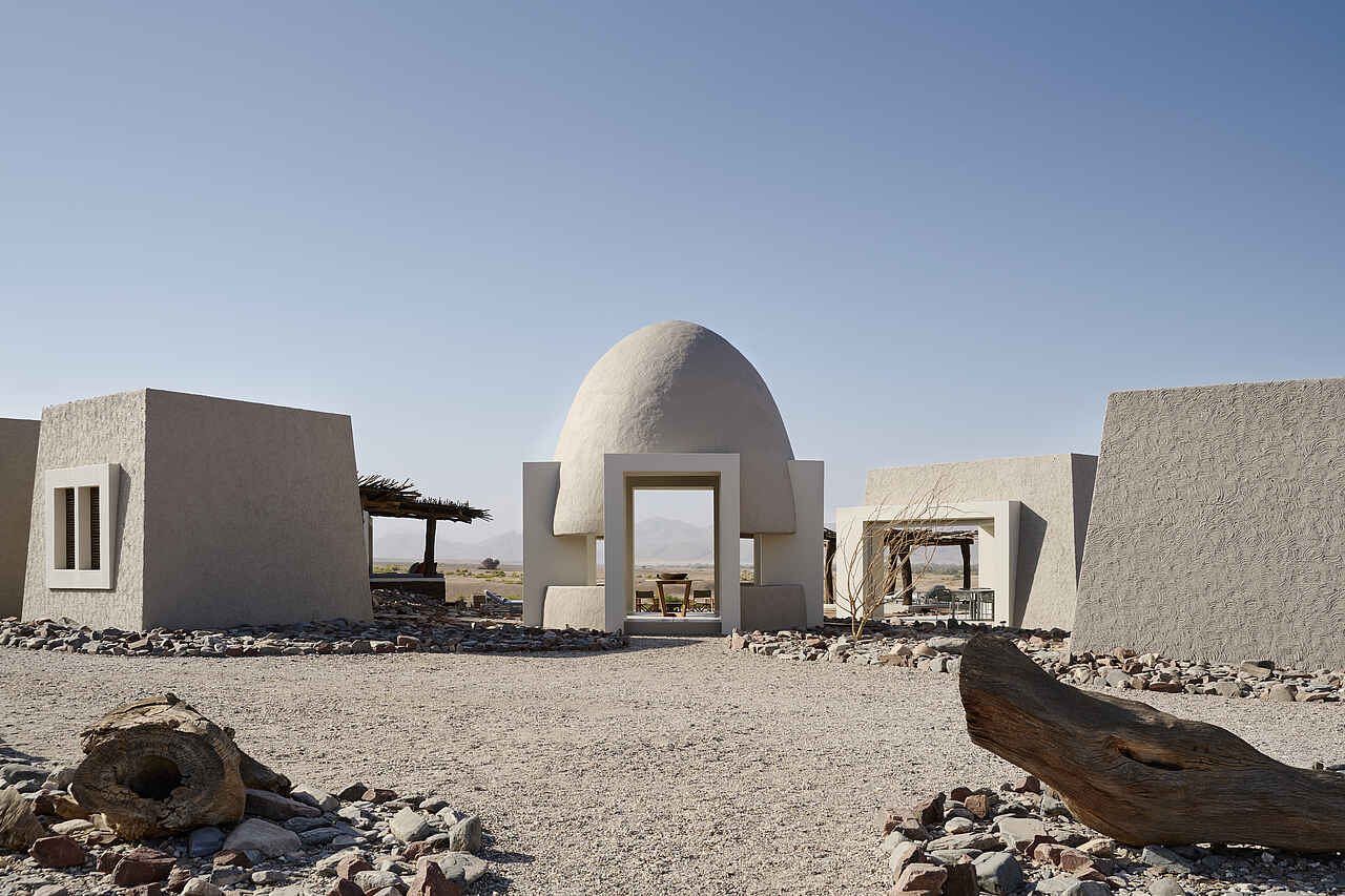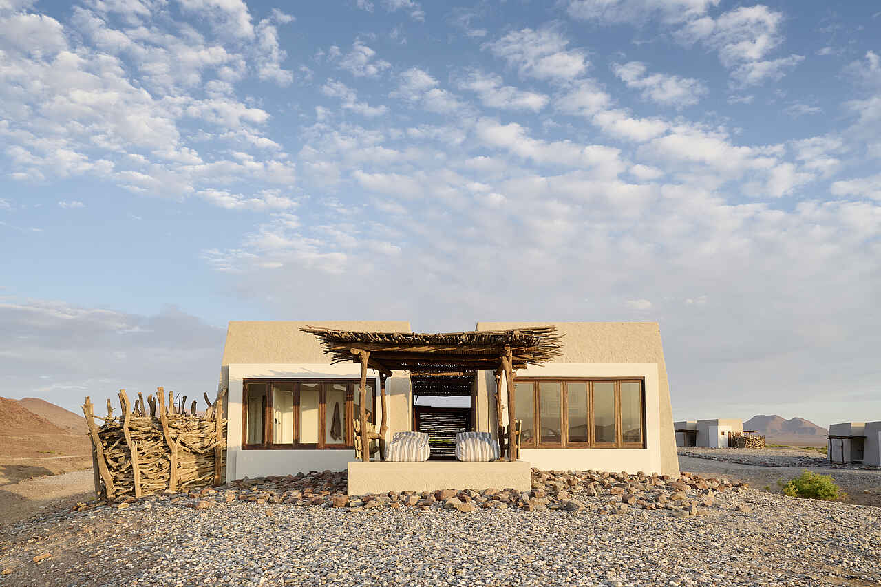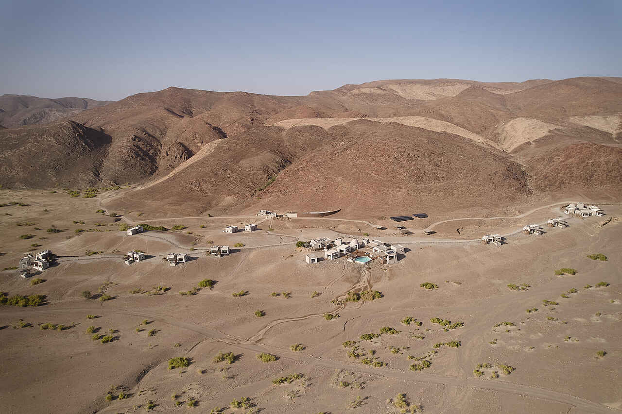 Die Lodge fügt sich harmonisch in die außergewöhnliche Landschaft ein und eröffnet beeindruckende Ausblicke auf zerklüftete Berge, Sanddünen und faszinierende Felsformationen. Der organische architektonische Stil, der die Wüstentopografie widerspiegelt, nutzt lokale Materialien wie Treibholz, Lehm und Stein auf eindrucksvolle Weise. Lokale Bräuche und Kultur finden sich im Design wieder, besonders im markanten Kuppeldach, das an ein traditionelles Himba-Haus erinnert.