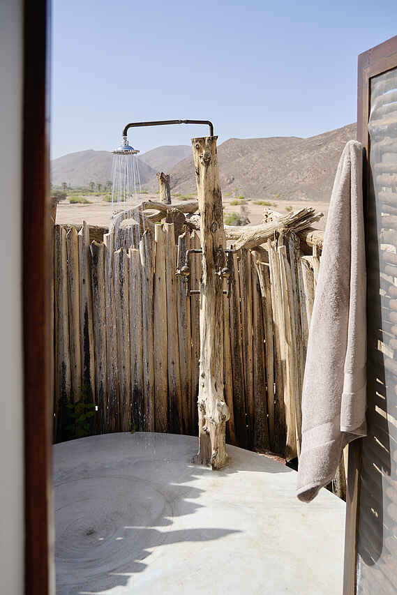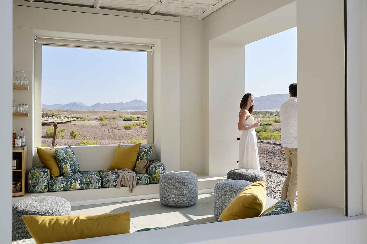 Jede der sieben geräumigen Suiten und die private Villa sind luxuriöse Rückzugsorte inmitten der rauen Wüstenlandschaft. Die Suiten sind luftig gestaltet und in beruhigenden Farbtönen gehalten, die zur Entspannung einladen. Die großzügigen Schlafzimmer sind mit komfortablen Kingsize-Betten ausgestattet. Die elegante Einrichtung verbindet modernes Design mit traditionellem afrikanischem Flair und schafft so eine harmonische Atmosphäre. Bodentiefe Fenster lassen viel natürliches Licht herein und eröffnen einen ungestörten Blick auf die Wüstenlandschaft.