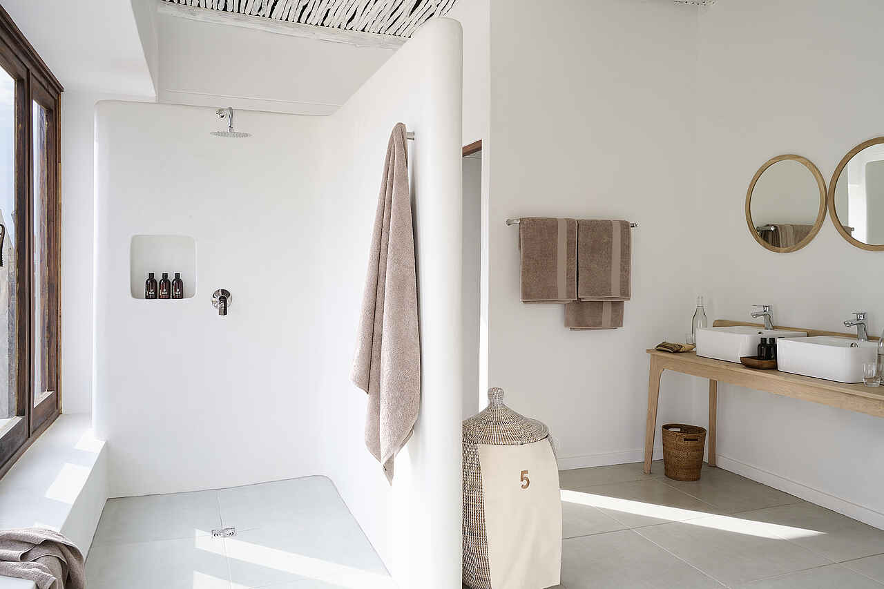 Die En-suite-Badezimmer verfügen über Doppelwaschbecken, eine Toilette sowie eine geräumige Innendusche aus gebleichtem weißem Putz, ergänzt durch eine Außendusche. Die private Veranda mit schattiger Terrasse und stilvoller Tagesliege ist ideal für ein Nickerchen am Nachmittag oder zum Lesen. Darüber hinaus sind die Suiten mit Klimaanlage sowie hochwertigen Tee- und Kaffeezubereitungsmöglichkeiten ausgestattet.