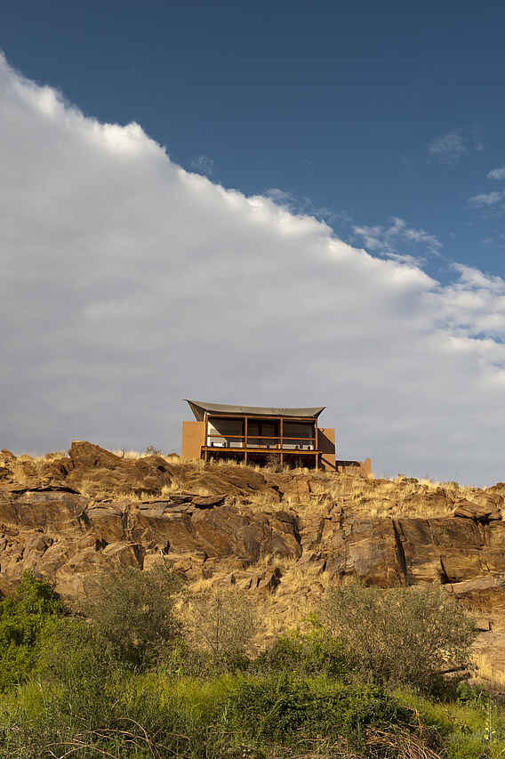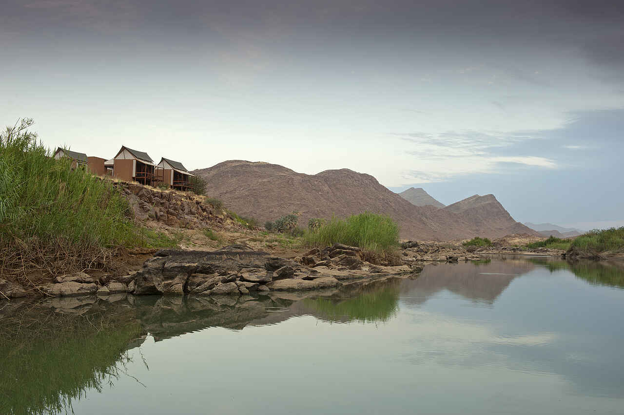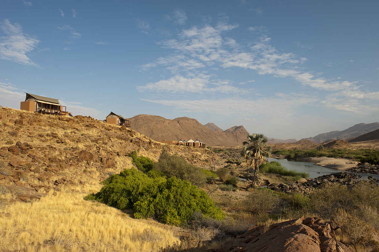 Auf einer Anhöhe direkt am Kunene River befindet sich das Camp in der Marienfluss Region weit im Nordwesten Namibias.