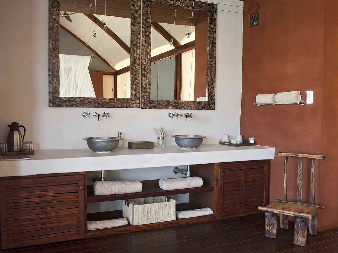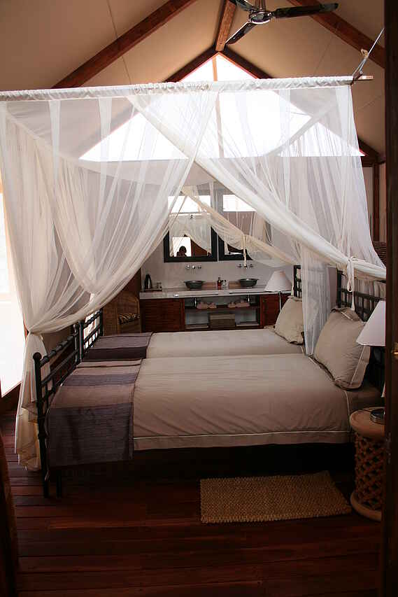6 luxuriöse Gästezelte, davon 5 mit Doppel- oder 2 Einzelbetten, und eine Family Suite mit zusätzlichem Schlafzimmer. Die Zelte bestehen aus Holz und Kanvas und bieten eine großartige Aussicht. Große Himmelbetten, En-Suite-Badezimmer mit Wanne und Dusche, Aussichtsdeck, Outdoor Dusche. Alle Räume sind Nichtraucherräume, Moskitonetze, Safe.