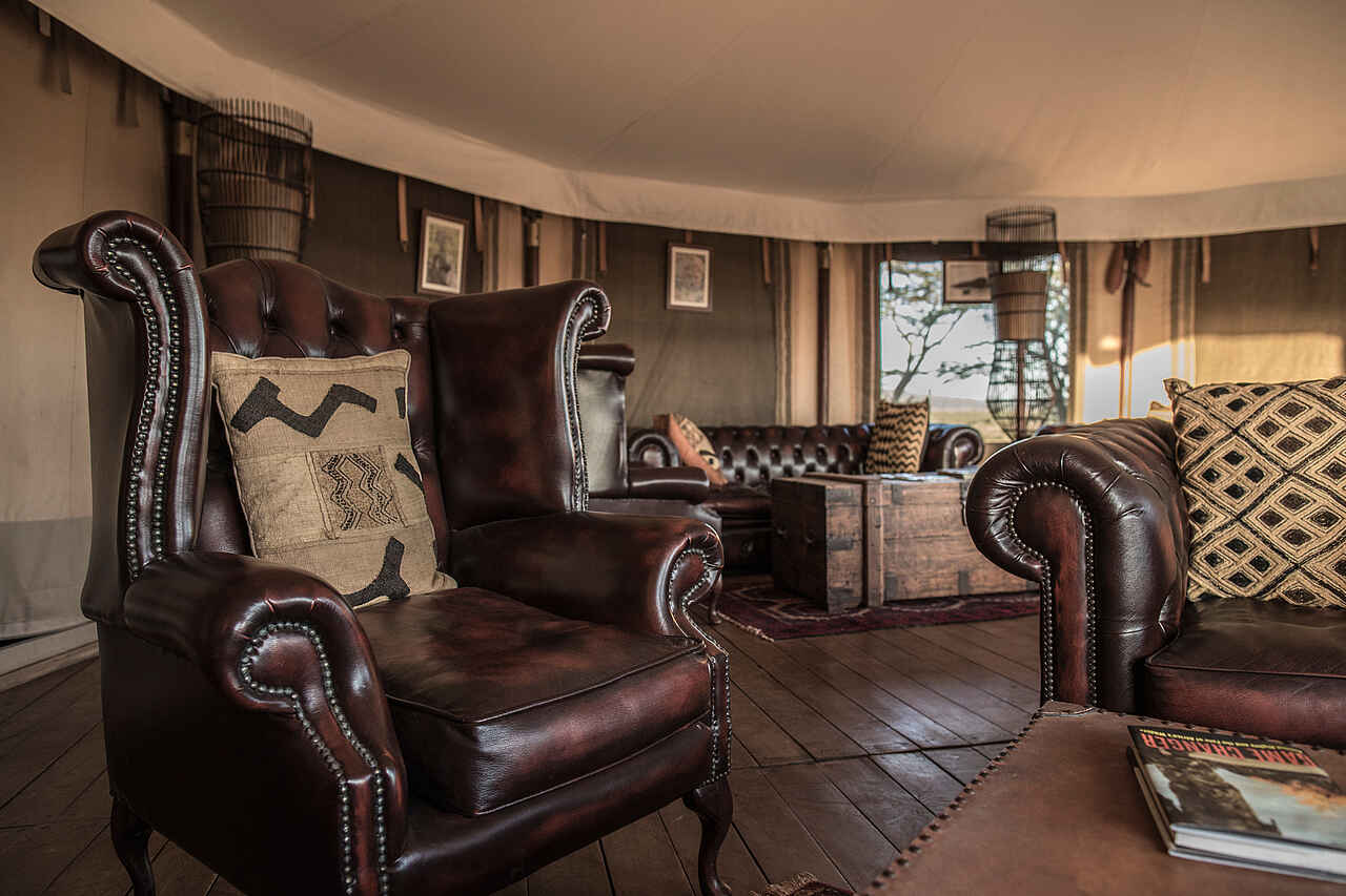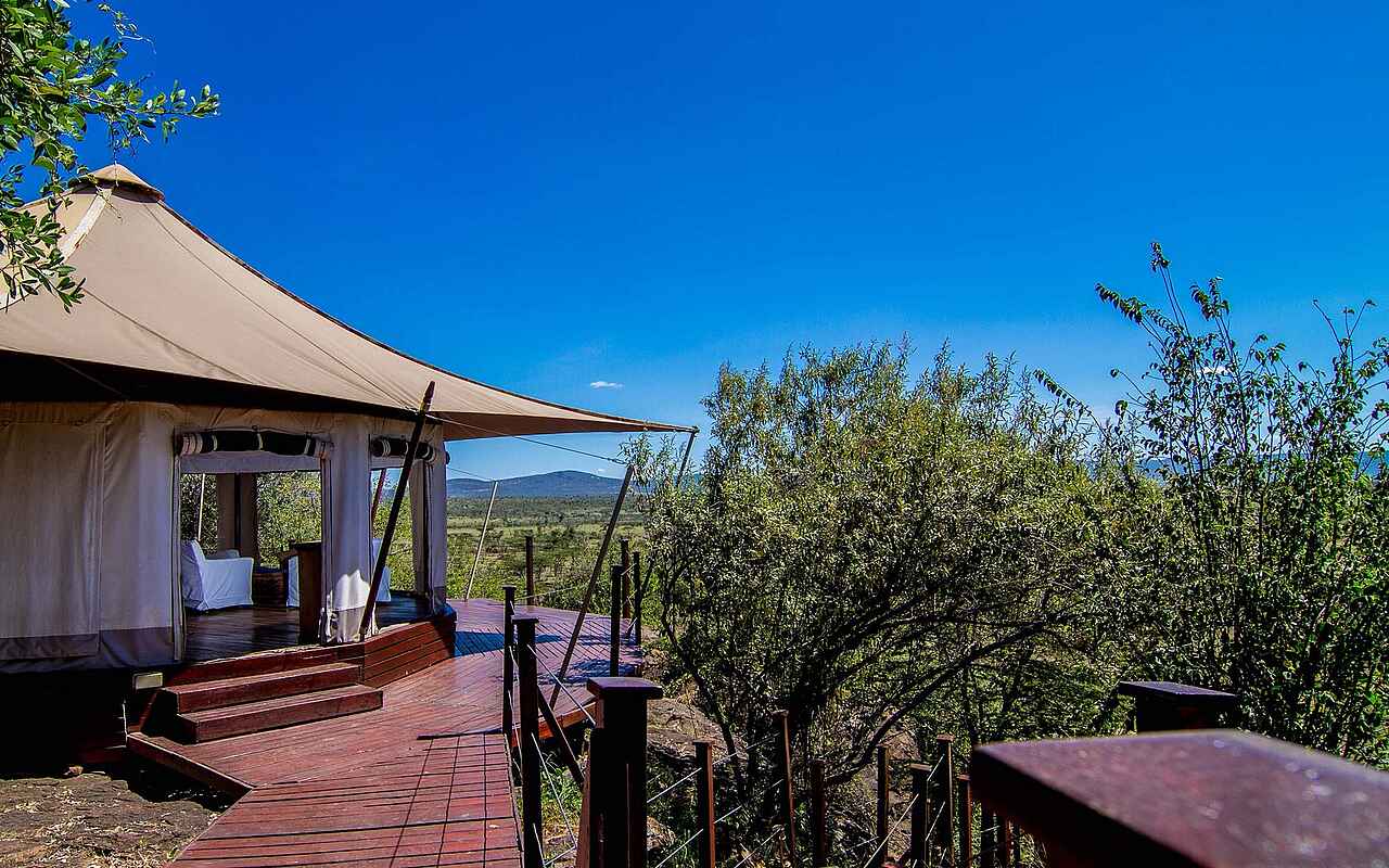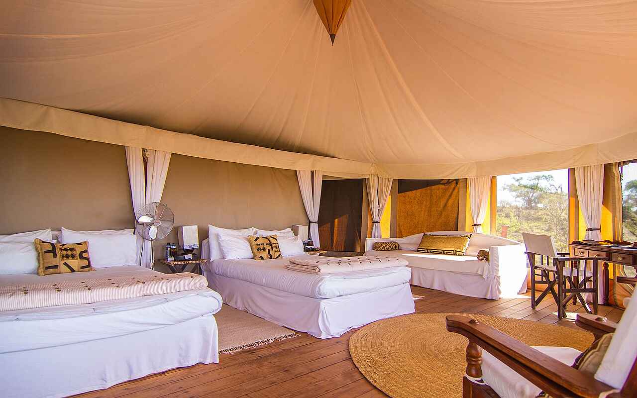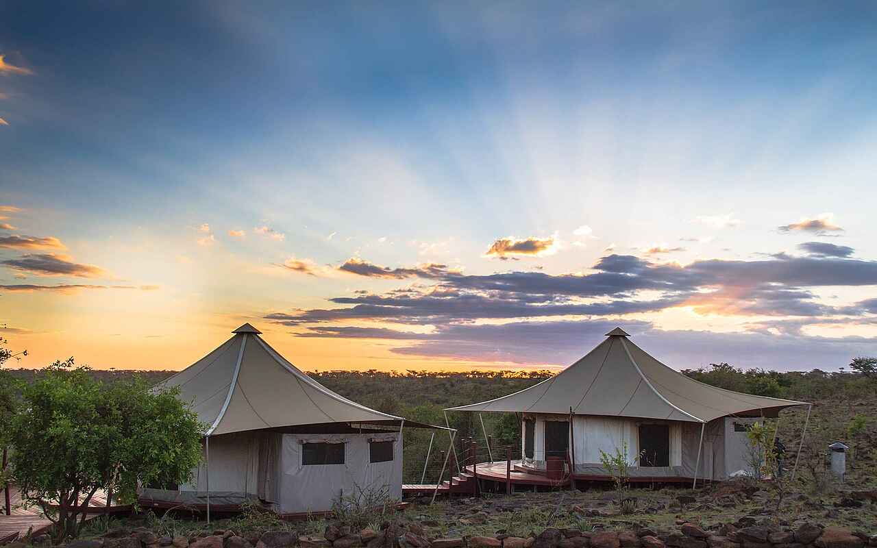 Dank der hellen Stoffe und der Canvaskonstruktion wirken die großzügigen runden Zelte von Ol Seki Camp leicht und luftig; kombinierte Lounge- und Schlafzimmer enthält breite Betten mit Moskitonetz, eine weiße Couch, Lounge-Sessel und einen Schreibtisch. Rundherum ist die Canvasaußenwand mit großflächigen Gitternetzen unterbrochen, die aus jeder Position im Zelt einen herrlichen Blick über die Mara freigeben. Die Holzböden bedecken Perser- und Bastteppichen. In einem Nebenraum befindet sich das eher schlichte Bad mit Toilette, Waschbecken und begehbarer Dusche. Alle Zelte halten Bademäntel, Fön, Wäscheservice und Wifi/Mobilempfang für den Gast vor. Das Hemingways Ol Seki Camp bietet seinen Gästen drei Unterkunftskategorien an: Simba Tent -auch das Penthouse im Busch genannt- mit 2 Schlafzimmern jeweils mit Ensuite Badezimmern in separaten Zelten, die über eine Steinterrasse miteinander und der Lounge verbunden sind. In der Lounge befindet sich eine kleine Küche, Esszimmer und Bar, Butlerservice inklusive. Ideale Privatsphäre für Freunde und Familien. Chui Tent -die Familien-Suite- mit 2 Schlafzimmern mit Ensuite Badezimmer in einem Zelt, das über Holzterrassen mit dem Wohnzelt mit Esszimmer, Küche und Bar verbunden sind.