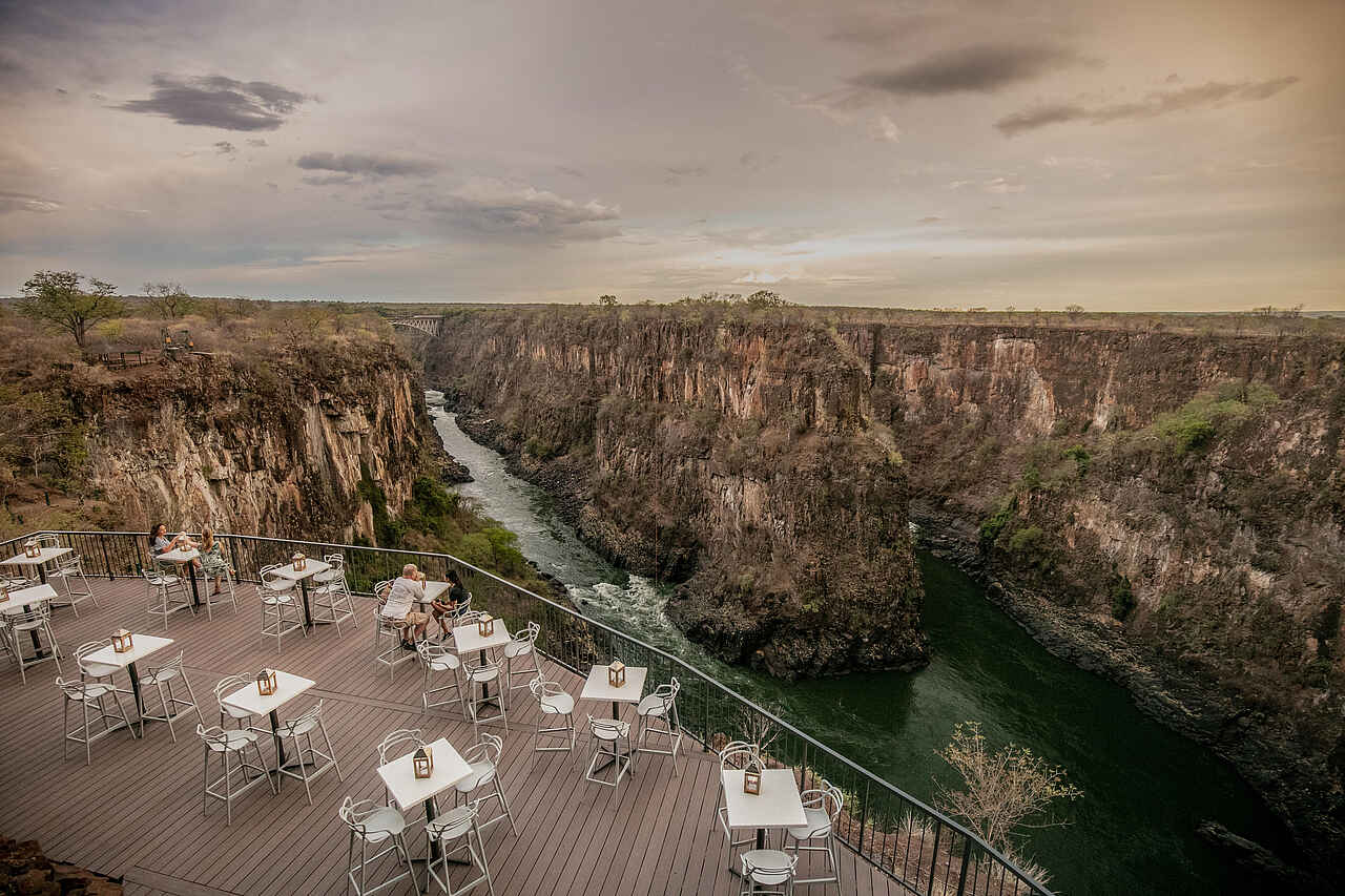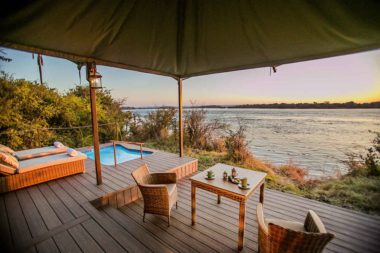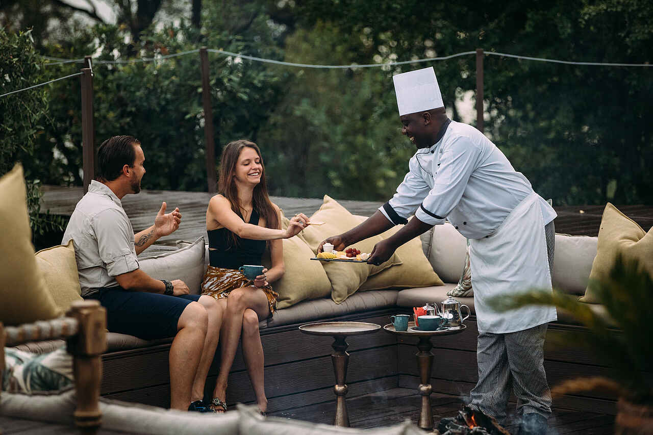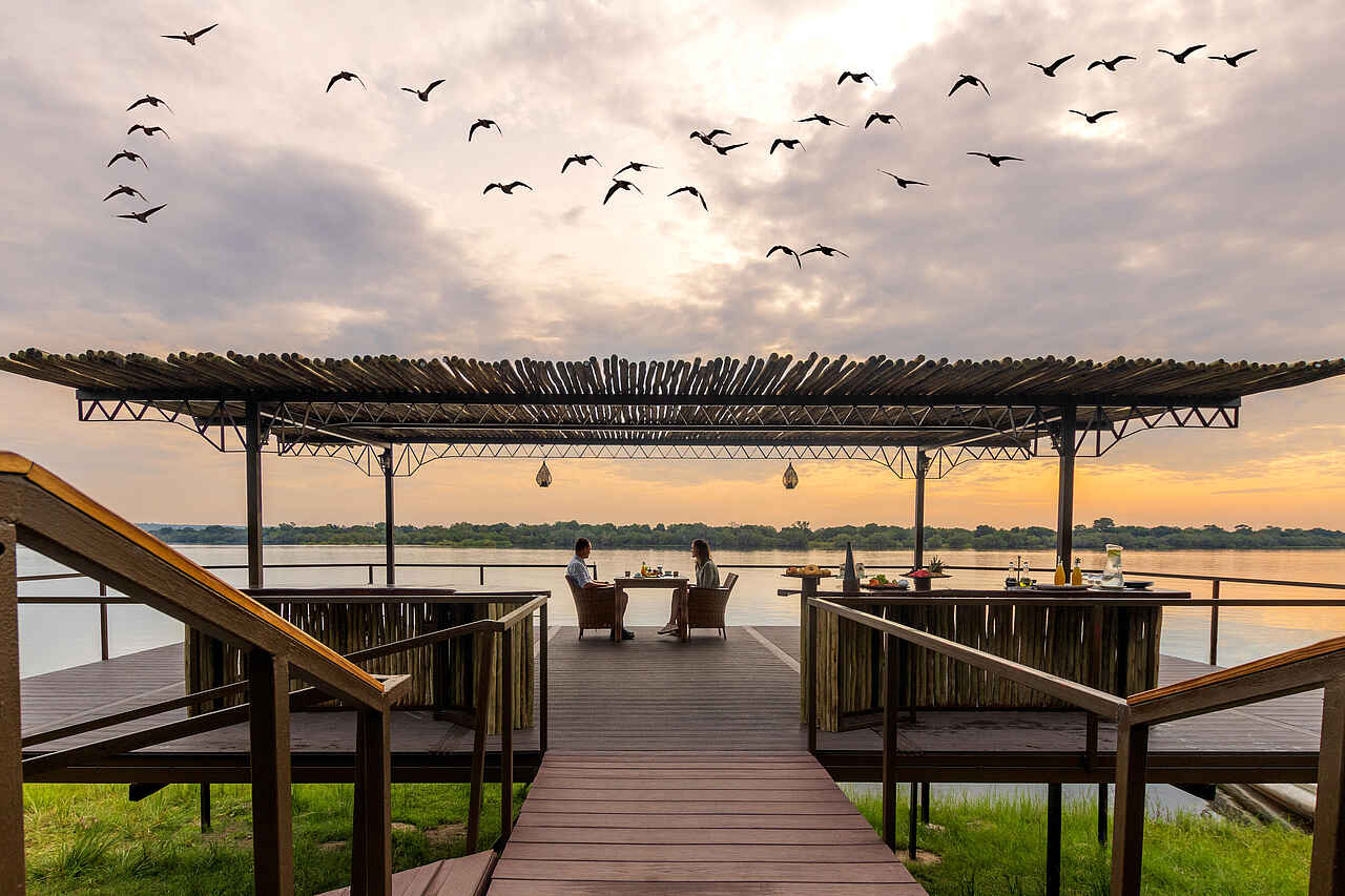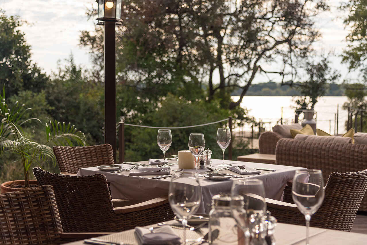 Die Mahlzeiten werden im zentralen Essbereich mit Blick auf den Sambesi-Fluss serviert, sowohl drinnen als auch draußen. Die Küche setzt auf frische, lokale Zutaten und kombiniert traditionelle afrikanische mit internationaler Küche. Zum Frühstück gibt es frisches Obst, Gebäck und warme Speisen, das Mittagessen wird oft als leichtes Buffet angeboten, und das Abendessen umfasst mehrere Gänge. Highlights sind Dinner unter freiem Himmel in der Boma oder private Abendessen auf der Suite-Terrasse. Alle Mahlzeiten und ausgewählte Getränke, inklusive lokaler Weine, sind inbegriffen. Besondere Ernährungswünsche werden gerne berücksichtigt, bitte im Voraus anmelden.