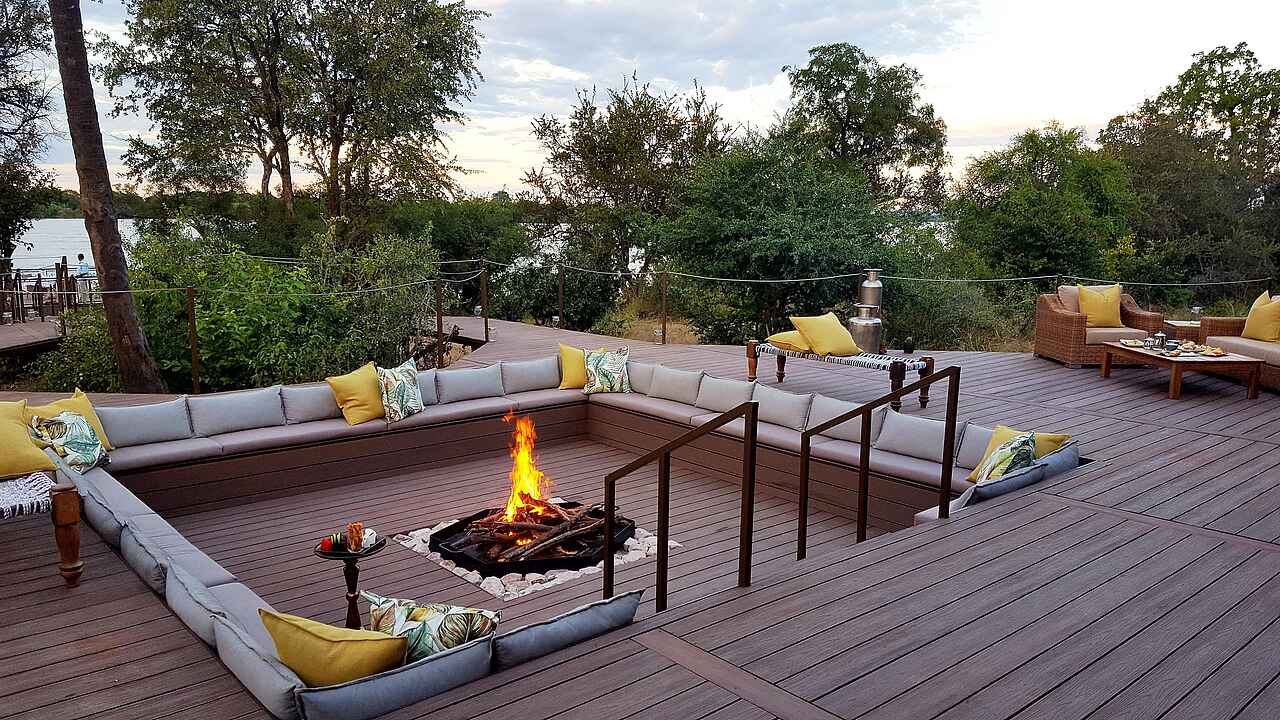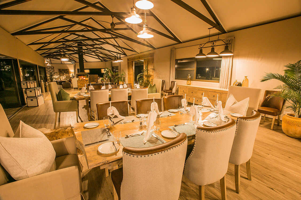 Der Hauptbereich der Old Drift Lodge besticht durch eine stilvolle Lounge mit bequemen Sitzgelegenheiten und einem Panoramablick auf den Sambesi. Der großzügige Essbereich lädt zu gemeinsamen Mahlzeiten ein, bei denen lokale und internationale Gerichte serviert werden. Abends sorgt die traditionelle Boma für stimmungsvolle Lagerfeuermomente unter dem afrikanischen Sternenhimmel.