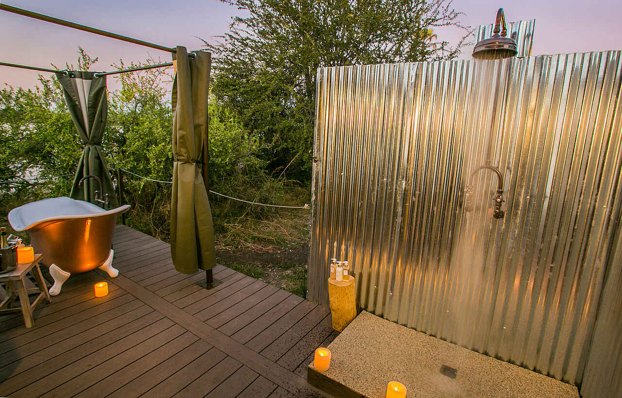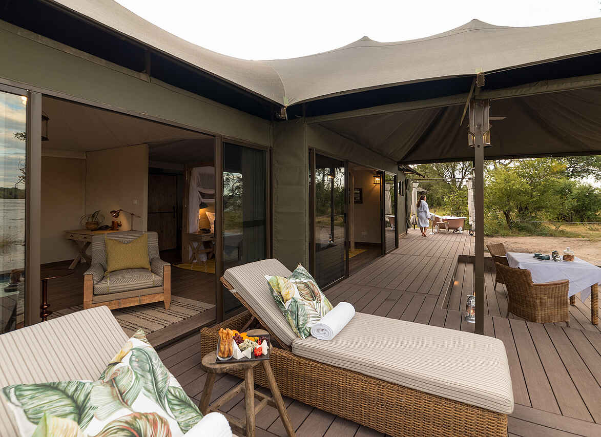 Das großzügige En-suite-Badezimmer bietet eine separate Toilette, Doppelwaschbecken und eine Regendusche. Ergänzend stehen Bademäntel, Hausschuhe, ein Haartrockner und hochwertige Pflegeprodukte bereit. Ein besonderes Highlight ist die freistehende Badewanne auf der privaten Terrasse sowie eine zusätzliche Außendusche. Auf der Veranda lädt zudem ein Plunge Pool zum Erfrischen mit Blick auf den Fluss und seine Tierwelt ein. Die Familiensuiten bieten die gleiche Ausstattung wie die Doppel-Suiten, verfügen jedoch über ein zusätzliches Schlafzimmer mit eigenem Bad.