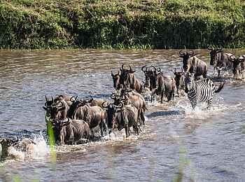 Die Serengeti ist Heimat einer unglaublichen Vielfalt an Wildtieren. Gäste des Ole Serai Luxury Camp - Kogatende haben die einzigartige Gelegenheit, einige der beeindruckendsten Tiere der Welt zu beobachten. Dazu gehören Löwen, Leoparden, Elefanten, Büffel und die seltenen Nashörner, die zusammen die berühmten Big Five bilden. Während der Großen Migration, einem der spektakulärsten Naturereignisse der Welt, ziehen Hunderttausende von Gnus und Zebras durch die Region. Diese riesigen Herden werden von Raubtieren wie Krokodilen, die in den Flüssen lauern, und Hyänen, die ihnen über die Ebenen folgen, begleitet.