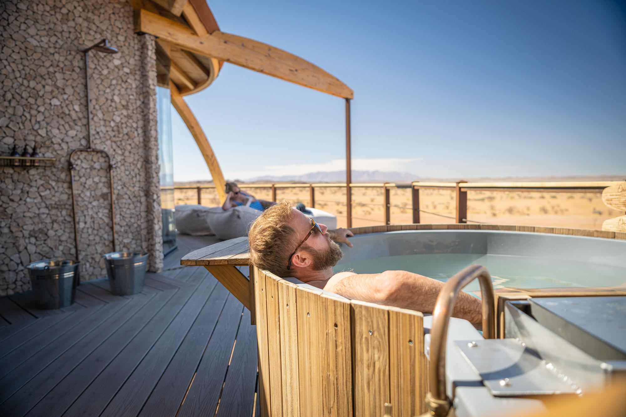 Das Herzstück der Onduli Enclave Private Villa ist das offen gestaltete Hauptgebäude mit stilvoller Lounge, interaktivem Essbereich, Bibliothek und moderner Küche, in der der private Koch individuelle Gerichte zubereitet. Große Fenster und fließende Übergänge nach draußen sorgen für ein luftiges Raumgefühl. Das weitläufige Sonnendeck mit Swimmingpool und schattigen Sitzplätzen lädt tagsüber zum Entspannen ein. Am Abend wird die Feuerstelle in der rustikalen Pizza-Boma zum stimmungsvollen Mittelpunkt, während über dem Damaraland der Sternenhimmel aufzieht. Spa-Behandlungen können auf Wunsch in privater Atmosphäre organisiert werden. Kostenfreies WLAN steht im gesamten Innen- und Außenbereich zur Verfügung.