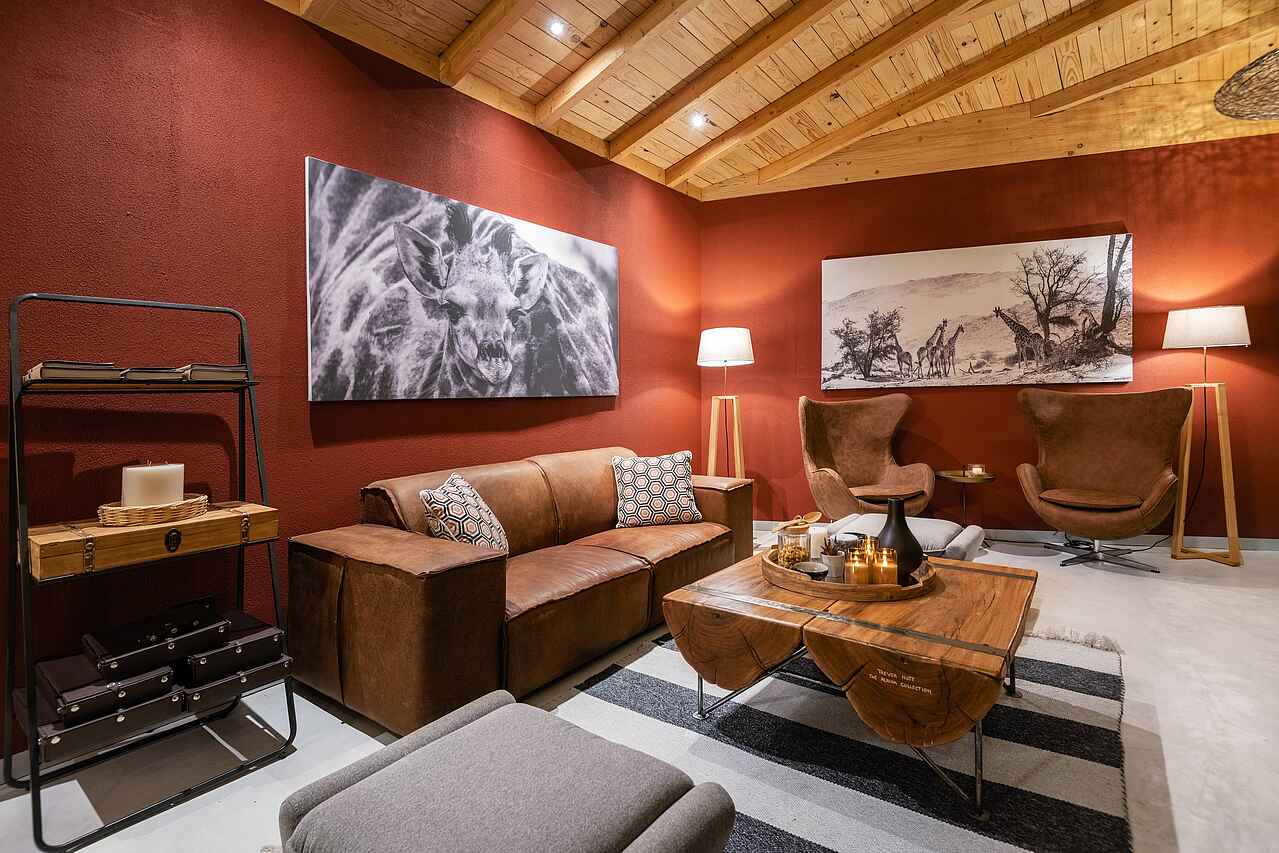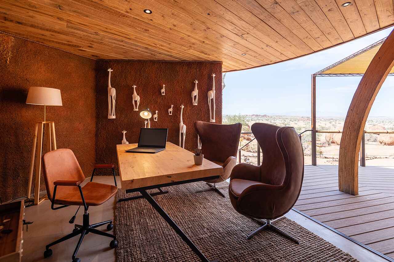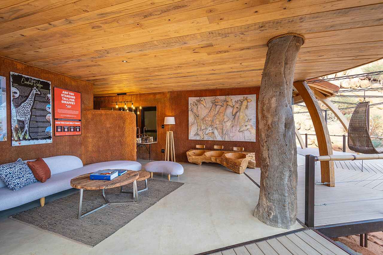 Das Camp ist stilvoll und mit viel Liebe zum Detail erbaut und erfüllt höchste Ansprüche. Die Lounge mit hellen Braun- und Terracotta-Tönen lädt zum Verweilen ein, die Bibliothek bietet eine erlesene Auswahl an Lektüre, an der Bar werden selbstverständlich tolle Drinks gemixt und an der Feuerstelle macht man es sich zur Blauen Stunde bequem. Ein großer Infinity-Pool mit Liegen und Sonnenschirmen lädt zum Relaxen und Erfrischen ein. Der lichtdurchflutete Essbereich geht in eine große Terrasse über. Durch diese Bauweise verschmelzen die Grenzen zwischen den Innenräumen und der Natur. Übrigens: Das Onduli Ridge wurde nach der ortsansässigen Giraffe benannt. Kostenloser Wäscheservice inklusive.