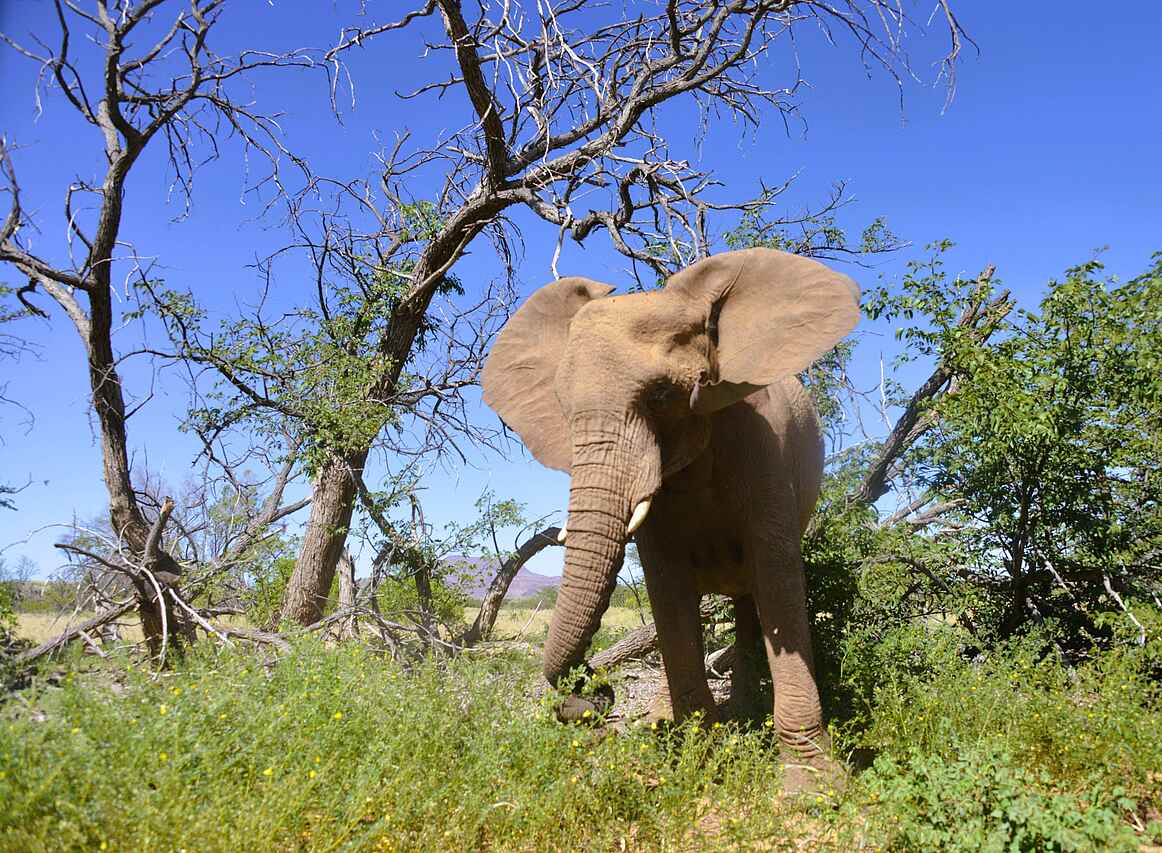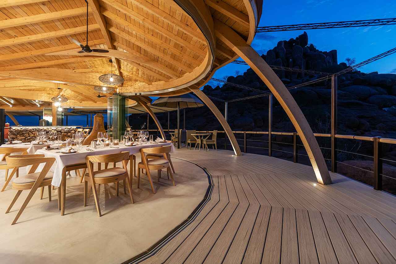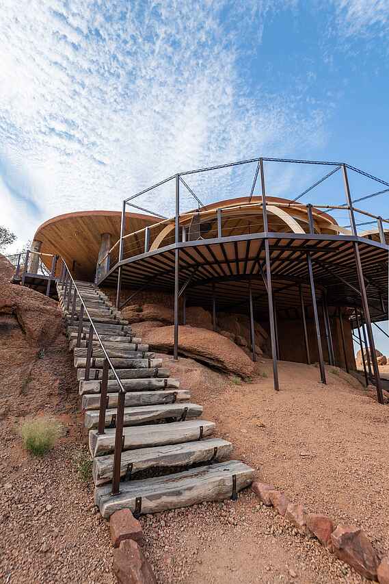 Man mixe eine bizarre Felslandschaft mit einem luftigen Luxuscamp, das an ein stylishes Ufo erinnert, und schon hat man das Onduli Ridge Camp. Das ungewöhnliche Camp mit nur 6 Zeltsuiten verwöhnt seine Gäste mit sensationellen Aussichten auf die Granitinselberge und Namibias höchsten Berg, den Brandberg. Das Camp punktet mit außergewöhnlicher Architektur, einem legendären Infinity-Pool und großartiger Küche. Spannende Tierbeobachtungen, allen voran von Elefanten, machen es zu einer idealen Safari-Location in Damaraland, Namibia!