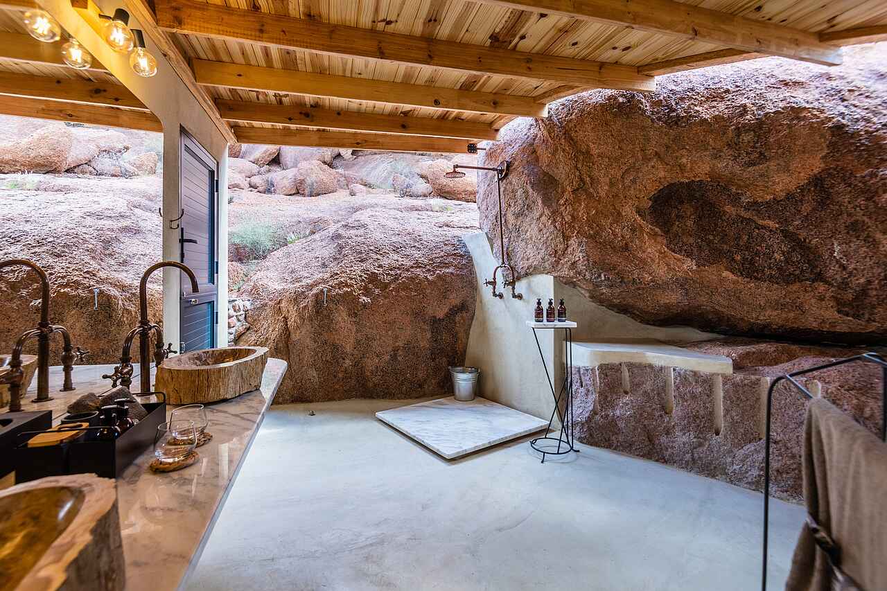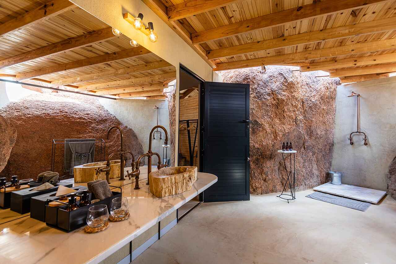 Sechs luxuriöse und große Suiten liegen versteckt zwischen den Granitblöcken, die das Camp umgeben. Eine stets angenehme Brise sorgt für natürlich belüftete Suiten, die weitgehend offene Bauweise der Gemeinschaftsbereiche nutzt diesen Effekt ebenfalls. Die Anordnung des Camps ist gut durchdacht und bietet optimale Aussichtspunkte auf die wahrlich außergewöhnliche Landschaft. Egal ob vom Bett, vom Schreibtisch oder teils offenem Badezimmer mit Regendusche - es bieten sich immer sensationelle Blickwinkel. Wer möchte, kann die Jalousien vollständig öffnen, so dass die Grenzen zwischen dem Innenraum und der Natur verschmilzt.