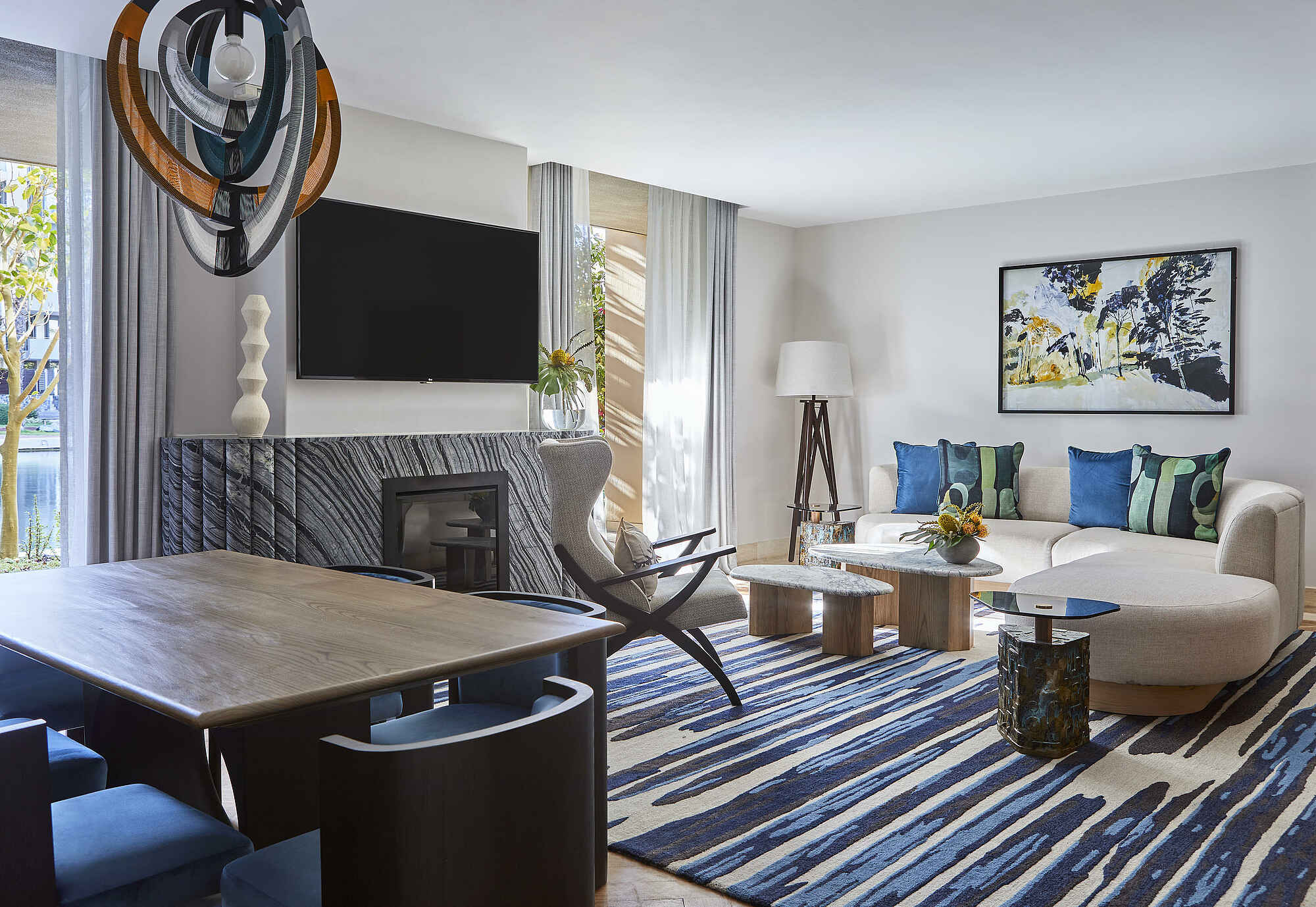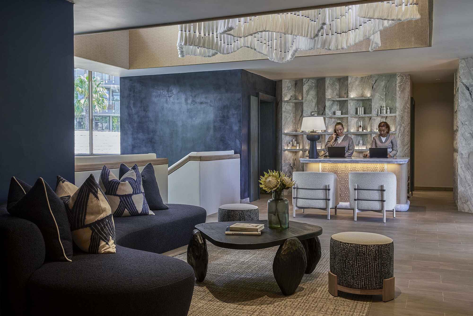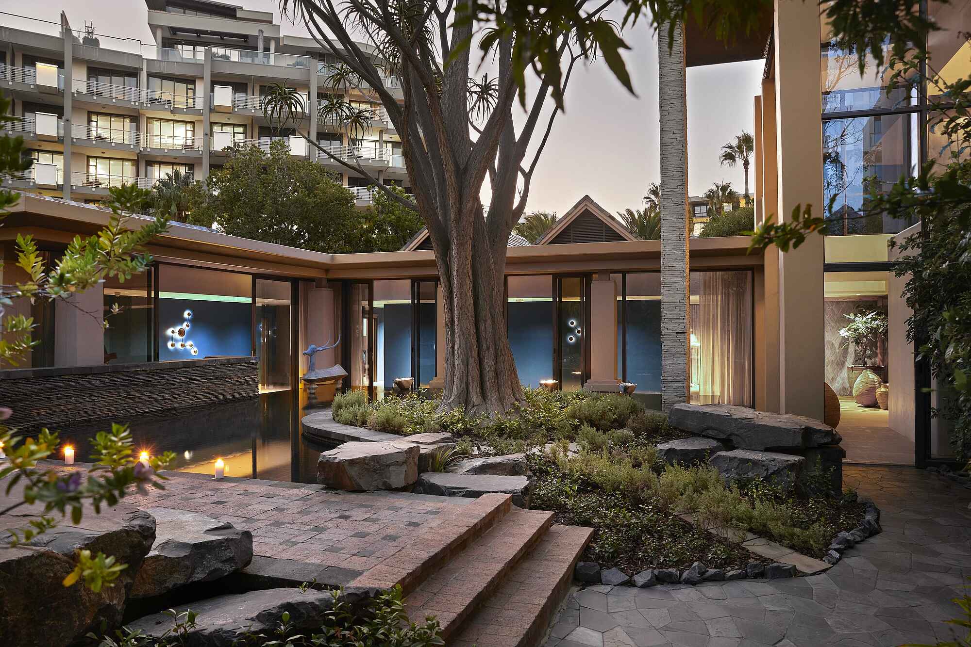 Im One&Only Cape Town Hotel trifft moderne Architektur auf afrikanisches Design. Der lichtdurchflutete Empfangsbereich öffnet sich zu stilvollen Lounges mit bequemen Sitzbereichen und spektakulärem Blick auf den Tafelberg. Das Herz der Anlage bildet die Vista Bar & Lounge mit hohen Glasfronten und eleganter Einrichtung. Der große beheizte Infinity-Pool liegt eingebettet in tropische Gärten und wird von gemütlichen Liegebereichen und Cabanas flankiert. Auf einer eigenen kleinen Insel befindet sich das Spa mit mehreren Behandlungsräumen, Sauna, Dampfbad und Ruhezonen. Ein topmodernes Fitnessstudio, ein gut ausgestatteter Kids Club sowie mehrere Boutiquen und Veranstaltungsräume runden das Angebot ab.