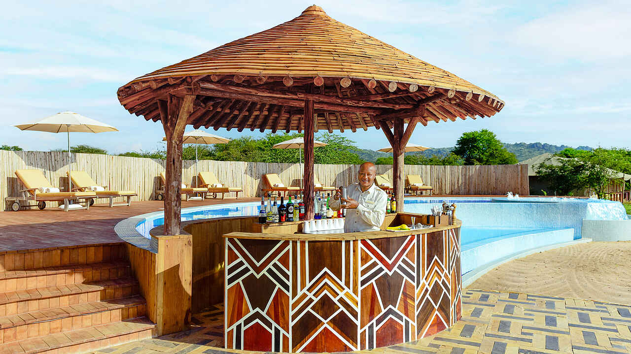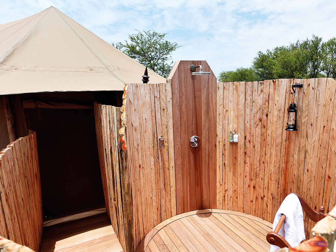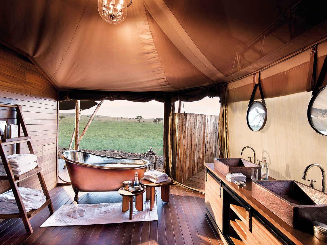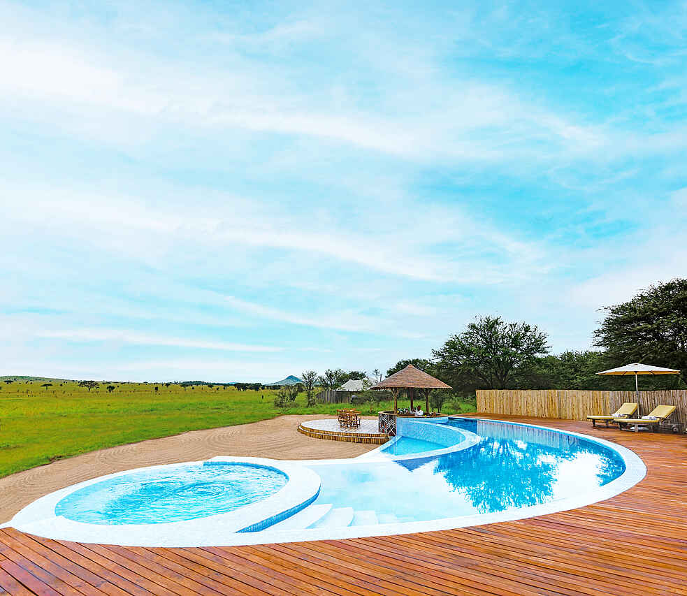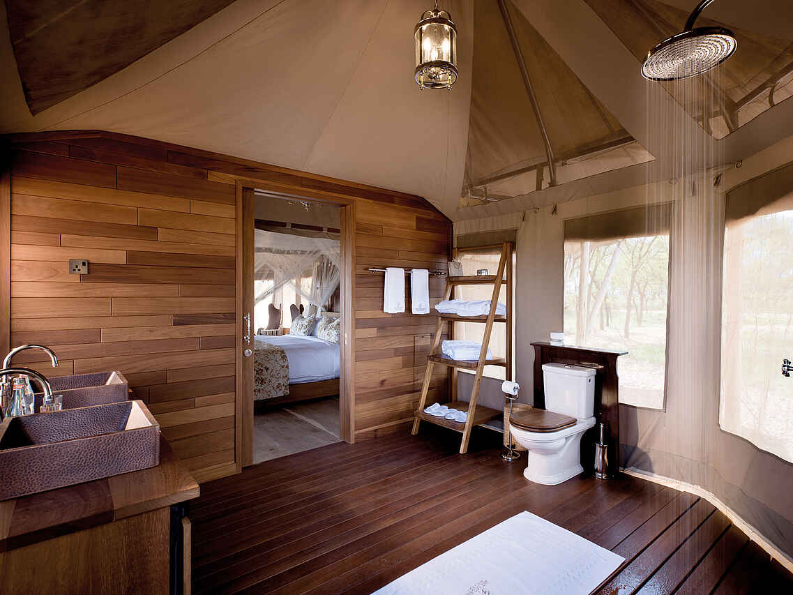 Herzstück des Camps ist das Lounge-Zelt, in dem eine Bar, ein Humidor mit einer Auswahl erlesener Zigarren und eine Bücherwand mit teuren Museumsstücken stehen, die sich um das Thema klassischer Safaris zu Beginn des 20. Jahrhunderts drehen. Selbst bei Vollbelegung ist genug Platz für alle Gäste. Rechts neben der Lounge steht das Restaurant-Zelt, in dem die Mahlzeiten an klassisch gedeckten Tafeln und Einzeltischen serviert werden. In gebührendem Abstand dazu steht der Poolbereich auf einer nicht einsehbaren hölzernen Plattform. Der Pool hat zwei Ebenen. Auf der oberen Ebene links gibt es einen Jacuzzi und rechts eine Bar, an die man heranschwimmen kann. Dazwischen fällt das Wasser über die Infinity-Kante in den unteren Pool. Der Blick vom Pool ist weit und offen.