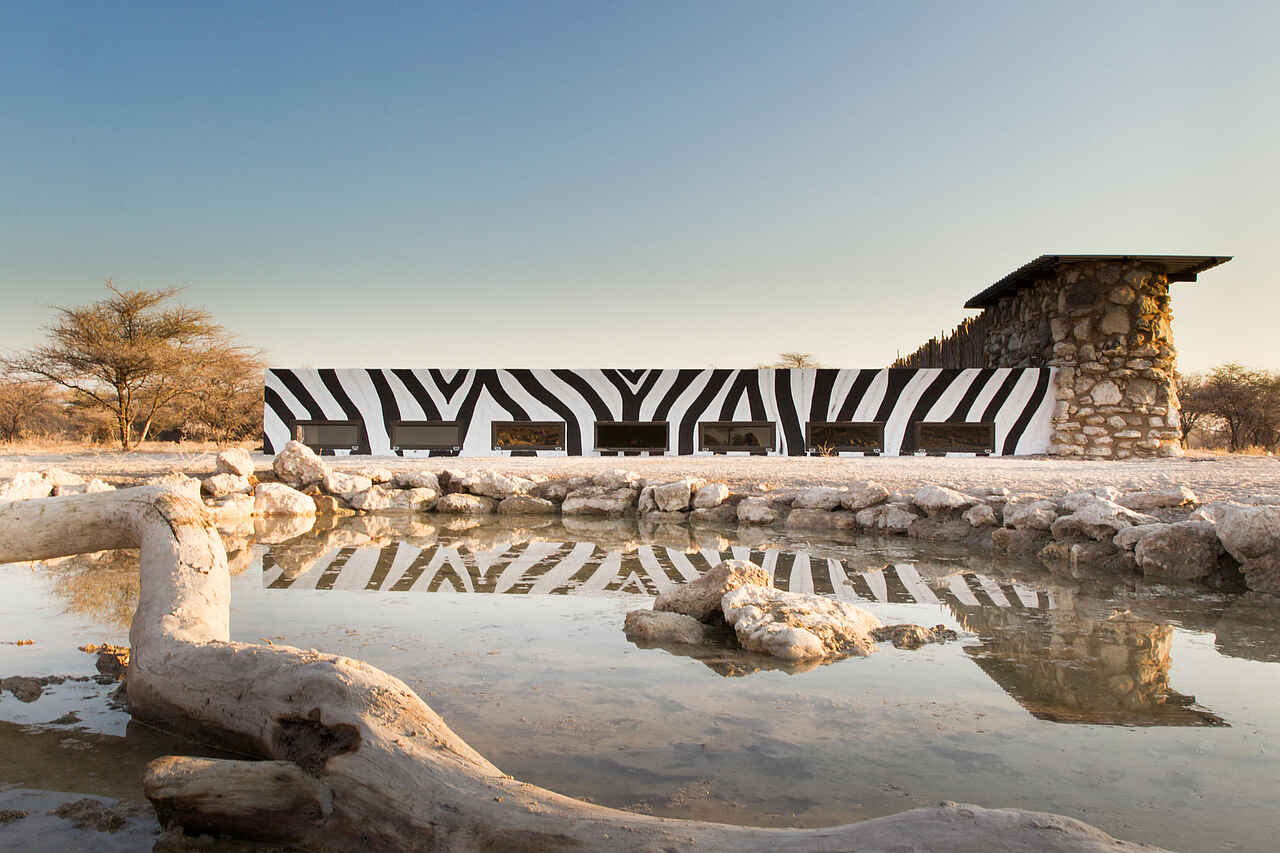 Das Herzstück der Lodge ist das Wasserloch, an dem sich den ganzen Tag hinweg verschiedenste Wildtiere tummeln. Die Suiten sowie der Zentralbereich und die darum verlaufenden Holzdecks wurden so konzipiert, dass man das Wasserloch immer im Blick hat.