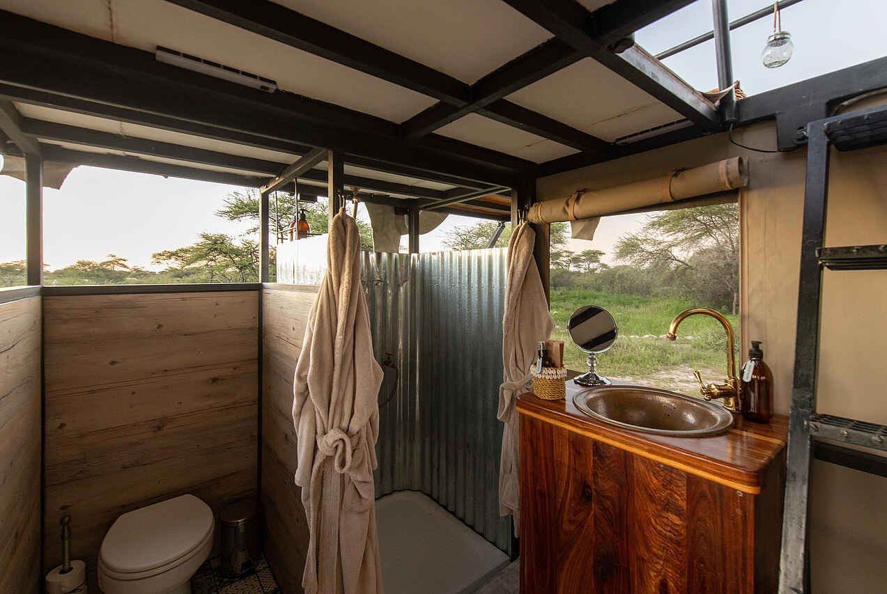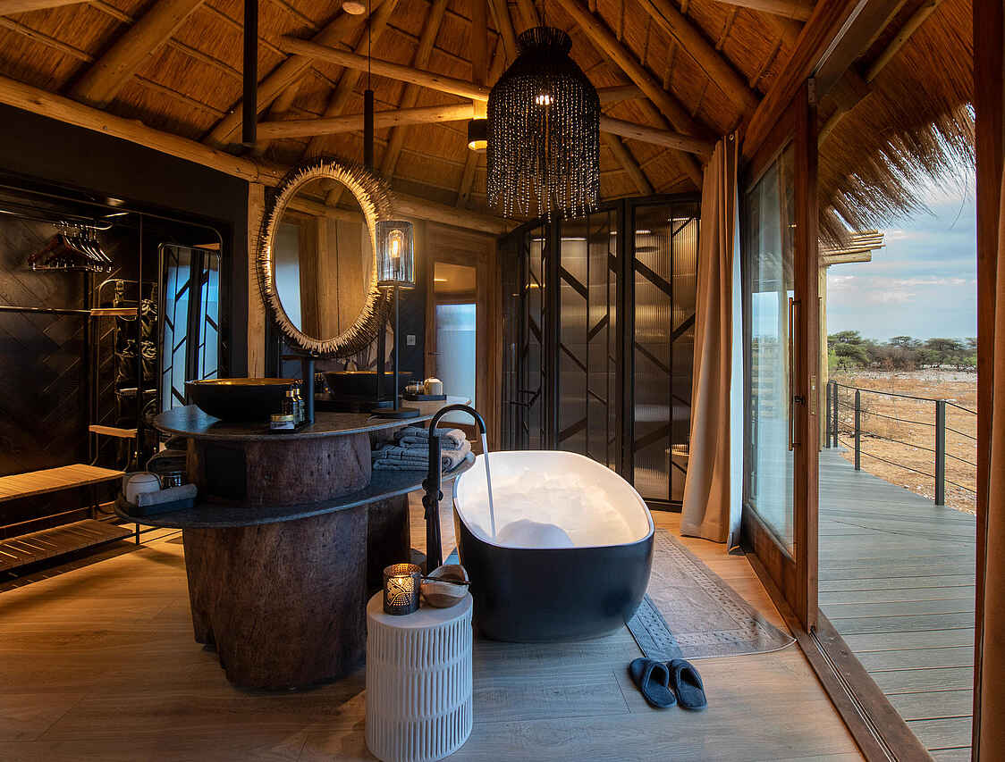 Die Suiten sind offen gestaltet. Im Wohnbereich befindet sich eine gut bestückte Bar. Auf dem Couchtisch liegen Ferngläser und Tierbestimmungsbücher bereit. Das King Size-bzw. Twin Size Bett befindet sich in der Mitte des Raumes und ist von wehenden Vorhängen umgeben. Es verfügt über eine Kühlung, die für eine angenehme Luftzirkulation sorgt. Jede Suite verfügt über ein luxuriöses En-suite-Badezimmer mit hochwertigen Armaturen, WC und Doppelwaschtisch. Geometrische Designs an der Glas- und Stahlduschwand verleihen einen Hauch von urbaner Eleganz und eine große Badewanne ist strategisch neben den Glastüren platziert.