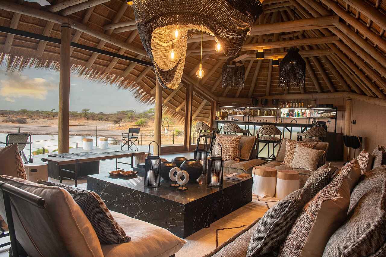 Der zentrale Bereich des Onguma Camp Kala umfasst einen offenen Essbereich und eine gemütliche Bar mit entspannter Atmosphäre. Es gibt eine offene Kochküche und eine Speisekammer, die den ganzen Tag über geöffnet ist und an der man sich bedienen kann. Direkt unterhalb der Bar befindet sich ein ebenerdiger Beobachtungsraum mit gemütlichen Sesseln und Fernrohren. Auch das kleine Fitnessstudio und das Spa verfügen über Glaswände, so dass man nie die Gelegenheit verpasst, Wildtiere zu beobachten.
