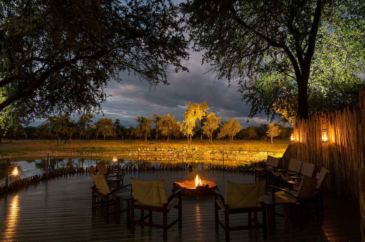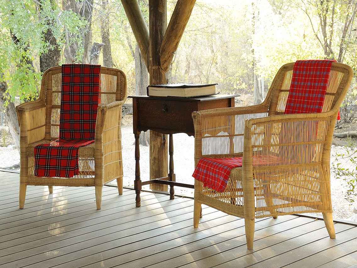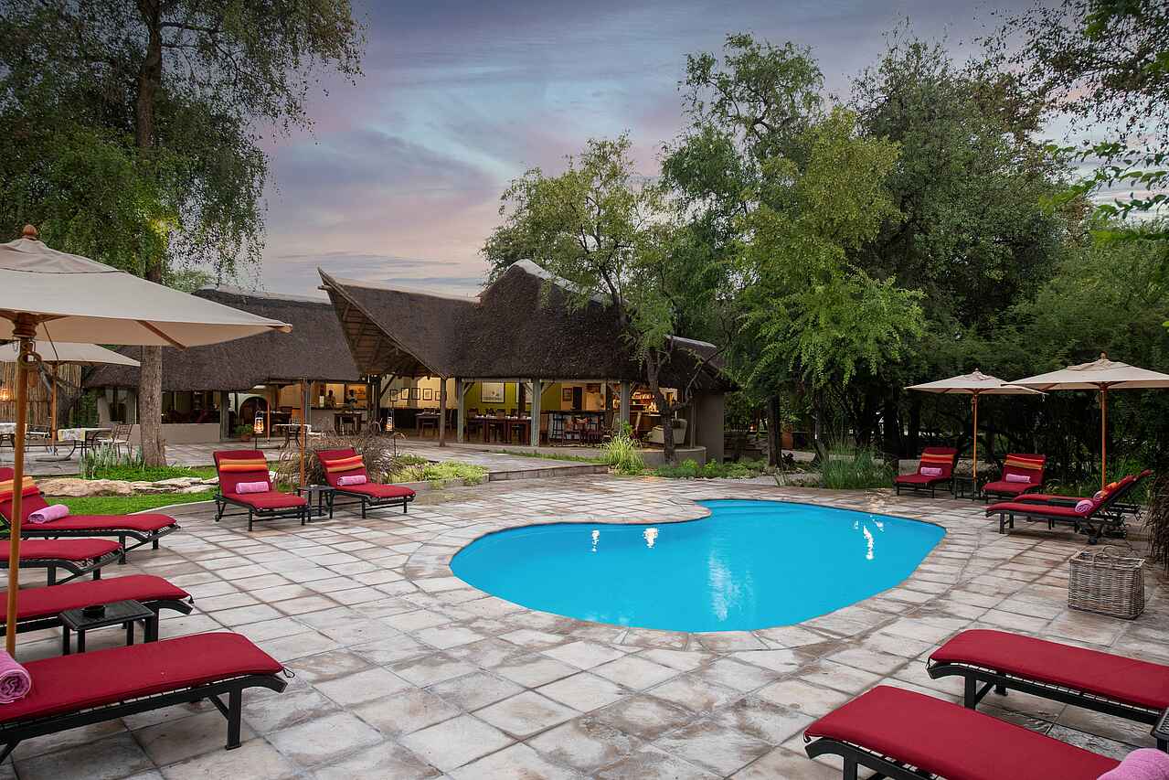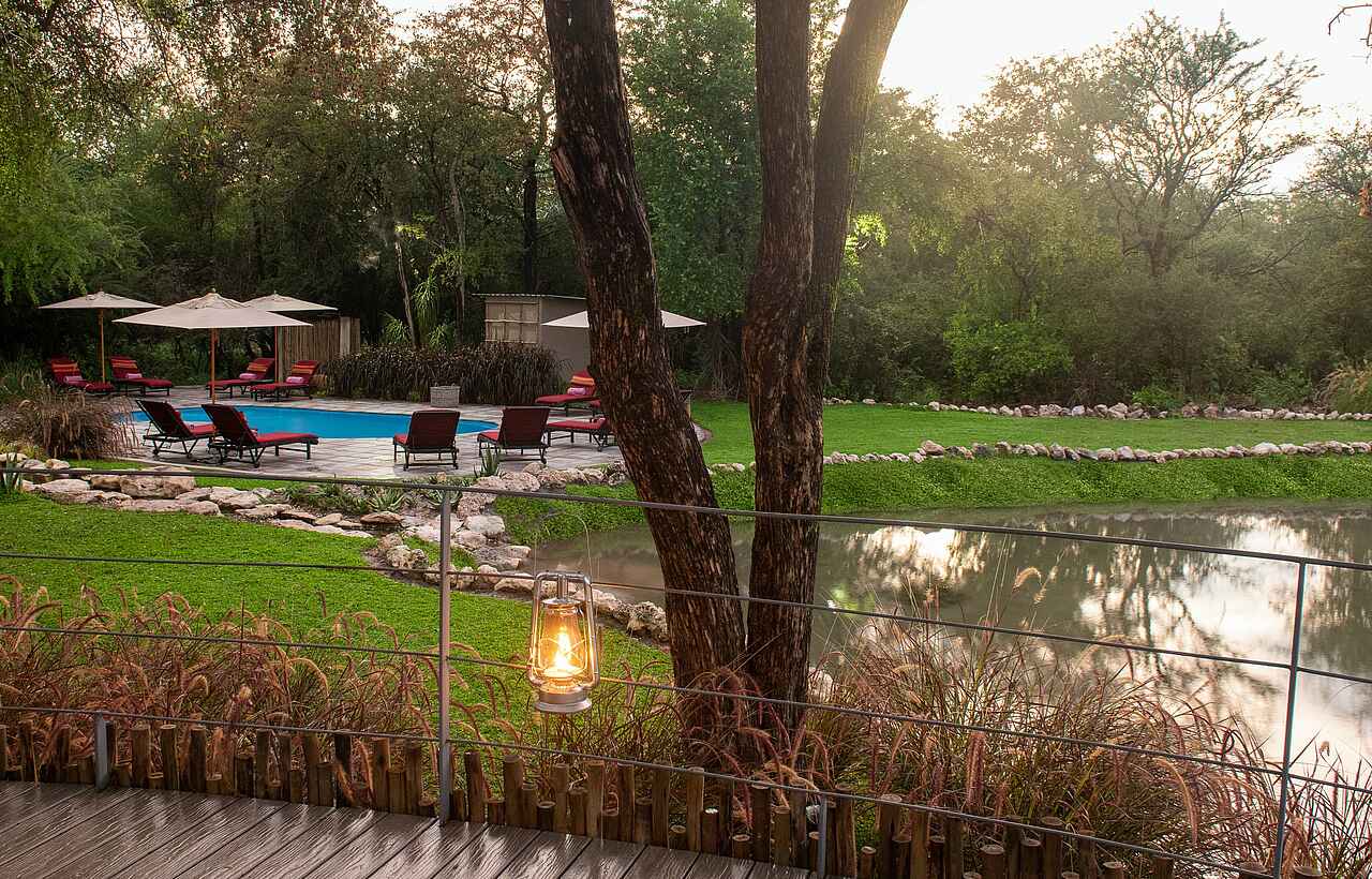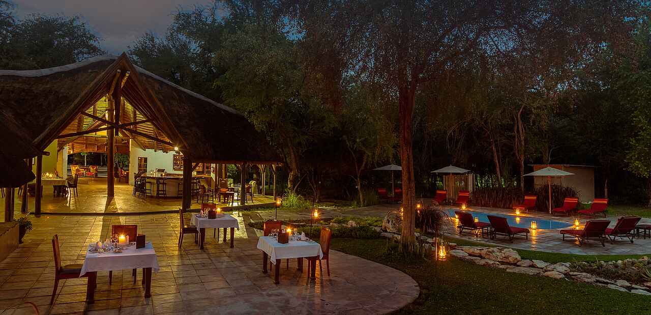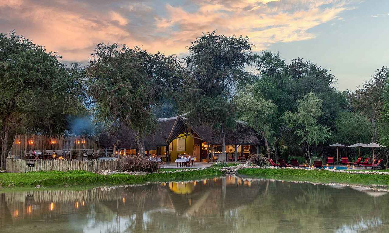 Das große, halboffene, strohgedeckte Haupthaus mit Lounge, Bar, Dining-Bereich und Terrasse ist mit der angrenzenden Boma (traditionelle Feuerstelle) und dem Pool das Herzstück des Camps. Im Onguma Forest Camp fühlt man sich sofort wohl. Das liegt zum einen an der herzlichen Belegschaft und zum anderen an der gemütlichen Einrichtung, die einen Hauch vergangener Zeiten widerspiegelt.