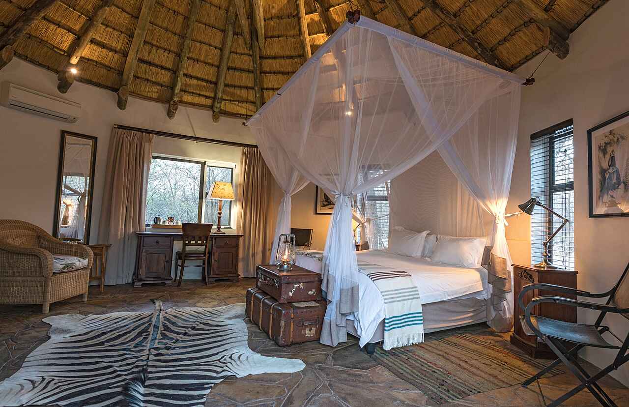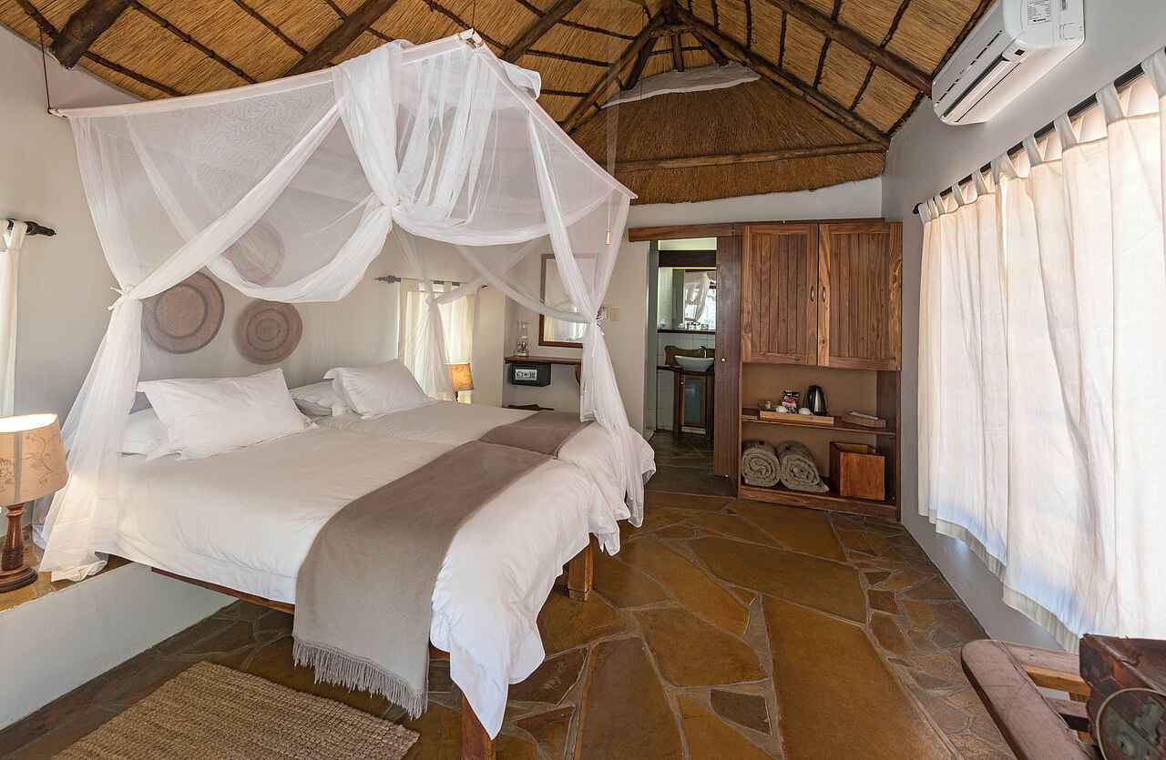 Alle Unterkünfte sind komfortabel, besitzen hohe Strohdächer, haben eine private Veranda mit Sitzgelegenheiten und eine gemütliche Einrichtung im Safaristil. Alte Safari-Reisetruhen und Koffer dienen als Ablageflächen und sind gleichzeitig ein nostalgischer Blickfang. Ein Himmelbett mit Moskitonetz, Rattan-Accessoires und Zebrafelle unterstreichen dies zusätzlich. Weitere Annehmlichkeiten: Haartrockner, Safe, Minibar und Klimaanlage.