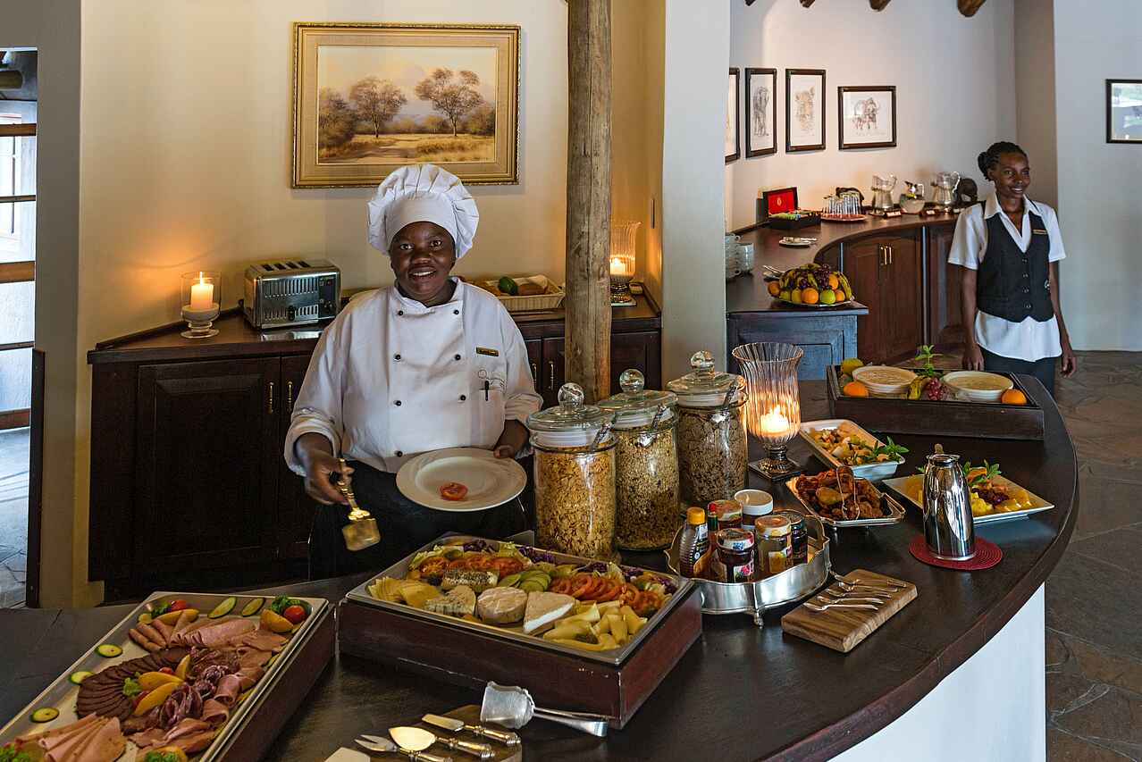 Gegessen wird im halboffenen Haupthaus oder auf der Terrasse an individuellen Tischen. Die Verpflegung erfolgt auf der Basis von Bed and Breakfast, Lunch (oder Picknickpakete für Ausflüge) und Dinner werden gegen Zuzahlung angeboten. Getränke sind nicht inkludiert. Ein Weinkeller sorgt für die richtige Weinbegleitung des abendlichen 3-Gänge-Menüs.