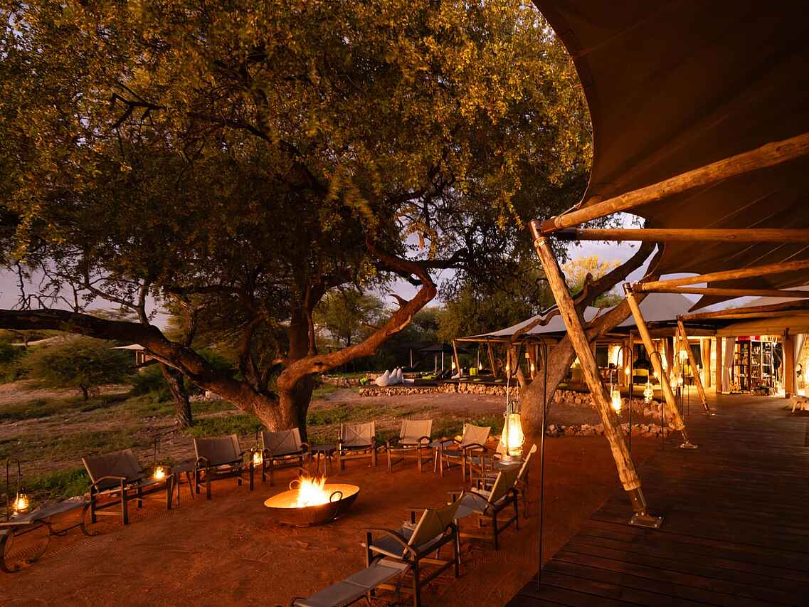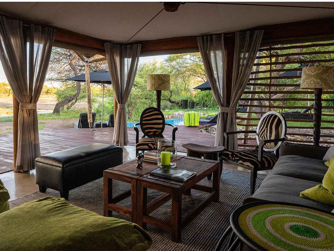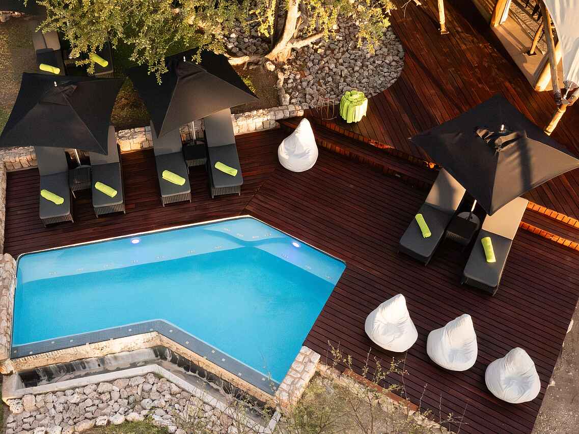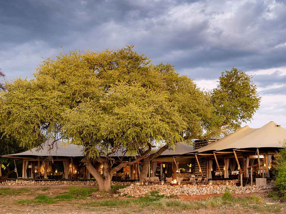 Es gibt 7 luxuriöse Zelte, die geschmackvoll eingerichtet sind und viel Platz bieten. In einem Zelt kommen 2 Personen unter. Jedes Zelt hat ein Doppelbett und Bad en suite mit einer Zinkbadewanne, 2 Waschbecken, fließend Kalt- und Warmwasser und Innen- und Außendusche. Die Toilette ist separat. Sowohl Zurückgezogenheit als auch ein toller Ausblick in die Umgebung und auf das nahe Wasserloch sind bei diesen Zelten gegeben. Jedes Zelt hat eine Veranda.