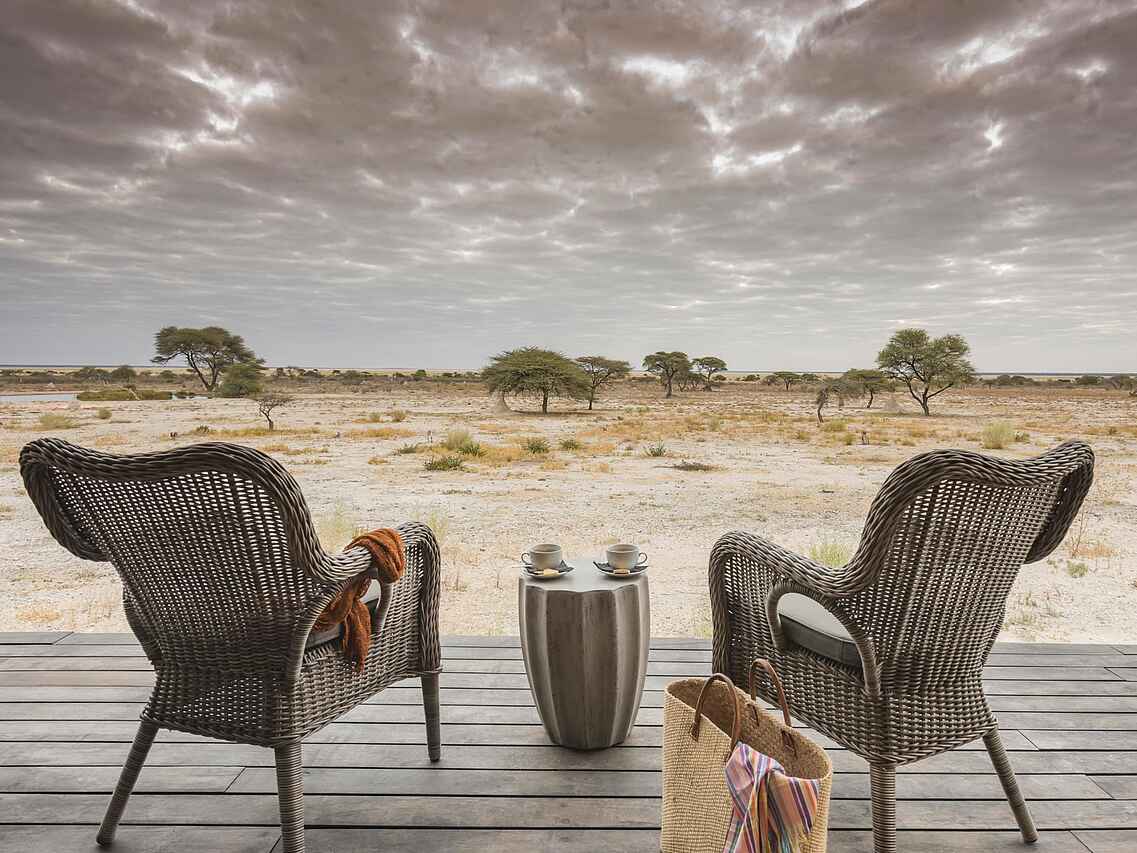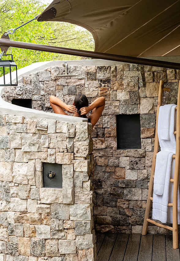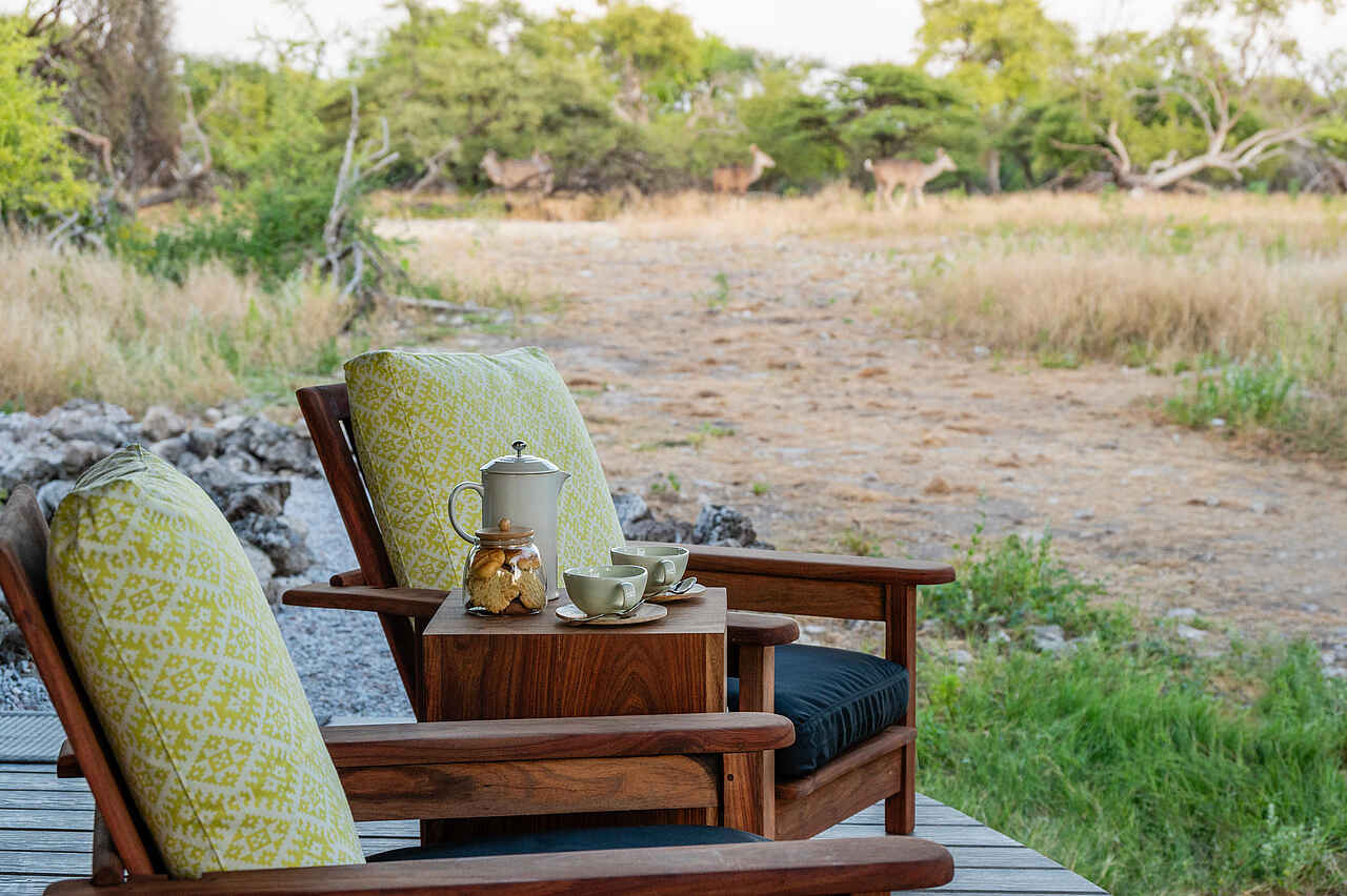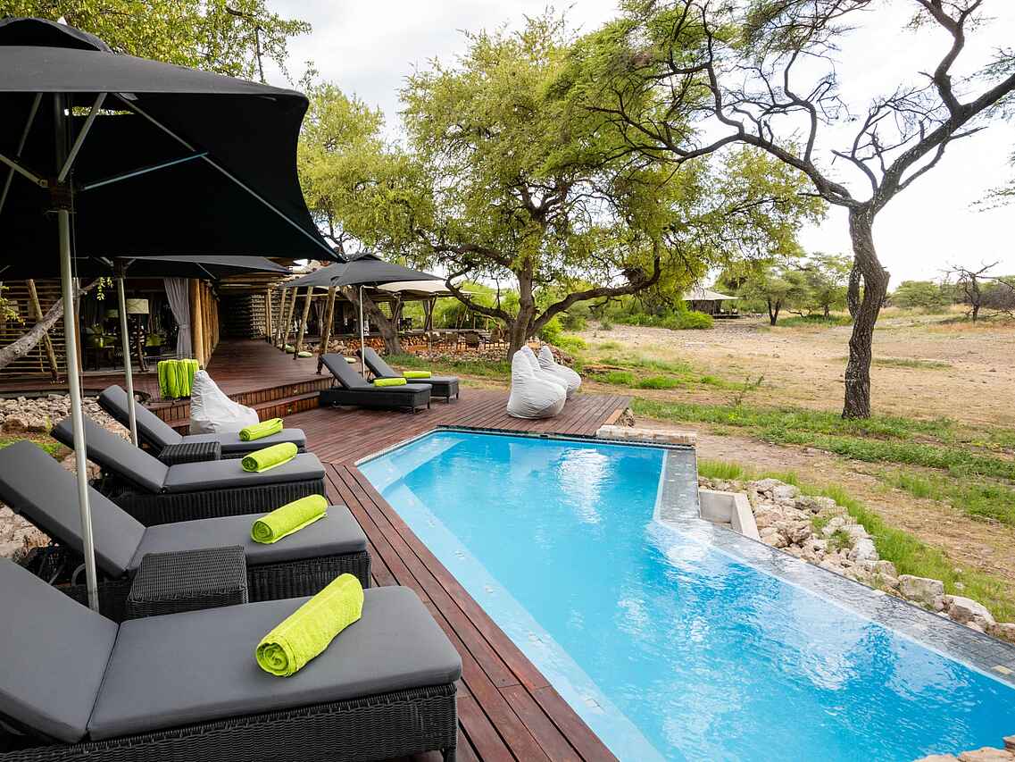 Es gibt 7 luxuriöse Zelte, die geschmackvoll eingerichtet sind und viel Platz bieten. In einem Zelt kommen 2 Personen unter. Jedes Zelt hat ein Doppelbett und Bad en suite mit einer Zinkbadewanne, 2 Waschbecken, fließend Kalt- und Warmwasser und Innen- und Außendusche. Die Toilette ist separat. Sowohl Zurückgezogenheit als auch ein toller Ausblick in die Umgebung und auf das nahe Wasserloch sind bei diesen Zelten gegeben. Jedes Zelt hat eine Veranda.