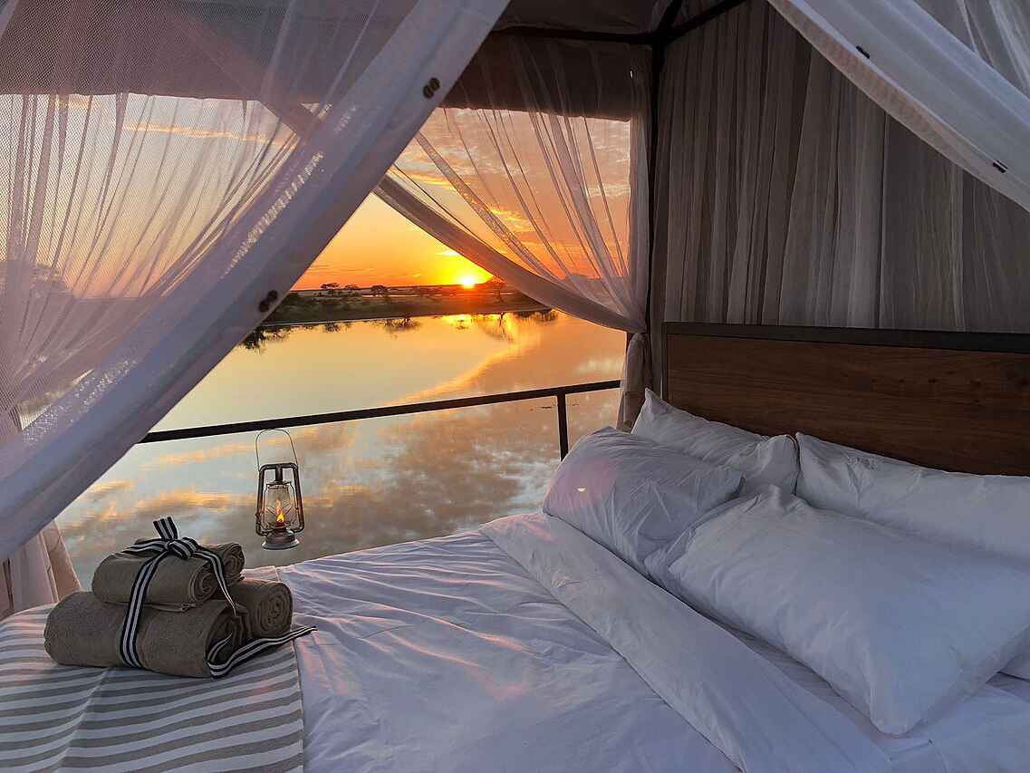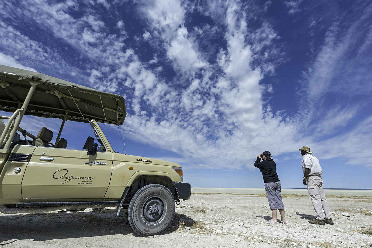 Die Onguma-Gruppe bietet eine Nacht unter Sternen im sogenannten Dream Cruiser an: 2 Gäste können in einem üppigen, auf dem Dach eines Geländefahrzeugs montierten Zelt im Freien übernachten. Zu diesem Arrangement gehören Abendessen im Busch direkt im Anschluss an eine Pirschfahrt. Vorausbuchung ist unbedingt empfohlen.