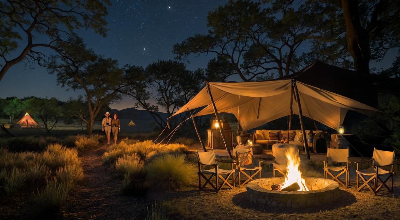 Der zentrale Treffpunkt des Camps ist ein schattiger Gemeinschaftsbereich mit Essplatz und Feuerstelle, der offen gestaltet ist. Abends findet hier das interaktive Boma-Dinner unter dem Sternenhimmel statt - oft begleitet von Geschichten der Guides oder kurzen Präsentationen zur Sternenkunde. Die Atmosphäre ist schlicht und einladend. Elektrischer Strom ist nicht durchgängig verfügbar, aber Lampen und Solarbeleuchtung sorgen für Orientierung. WLAN oder Mobilfunkempfang sind bewusst nicht vorhanden - der Fokus liegt ganz auf dem Erleben der Natur.