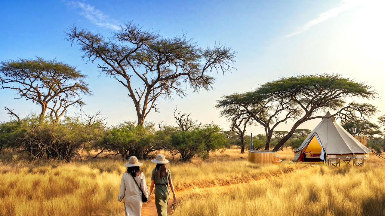 Das Onguma Trails Camp bietet vier großzügige Glamping-Zelte im Glockenzeltstil, die auf Komfort trotz Reduktion setzen. Jedes Zelt verfügt über extralange King- oder Twin-Betten mit hochwertiger Bettwäsche sowie eine Sitzecke mit Ausblick. Die offenen Badezimmer befinden sich direkt am Zelt und umfassen eine warme Eimerdusche sowie eine umweltfreundliche Komposttoilette mit regulärem Sitz. Ein besonderes Highlight jeder Unterkunft ist die private, holzbefeuerte Badewanne unter freiem Himmel - ideal zur Entspannung nach den Wanderungen. Elektrizität steht in Form von Solarleuchten zur Verfügung. Kamera- und Handyakkus können im Camp geladen werden. Die Zelte sind für zwei Personen ausgelegt; es gibt keine speziellen Familienzelte.