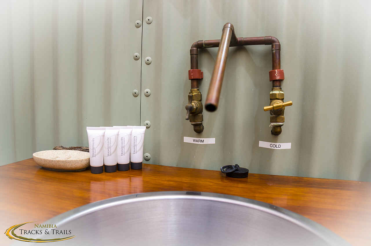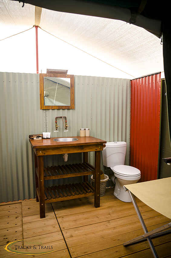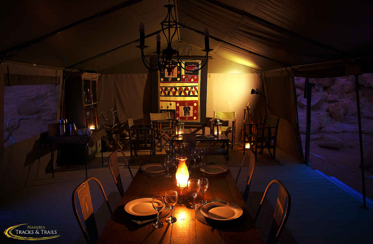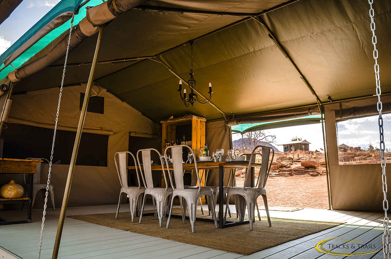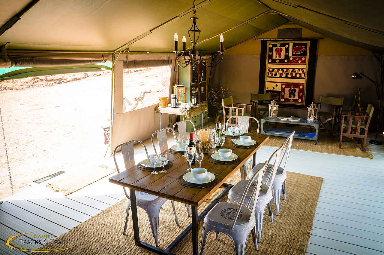 Im Hauptzelt befindet sich eine kleine Lounge mit Kaffee/Tee Station sowie der Essbereich, der teils mit einem Grassdach bedeckt ist. Von hier aus geht es hinaus zu einer Feuerstelle mit Sitzgelegenheit und Blick über das Ugab Trockenflussbett.