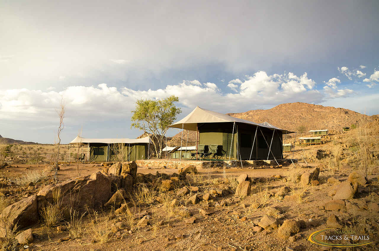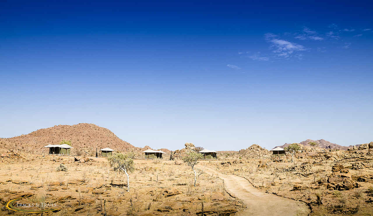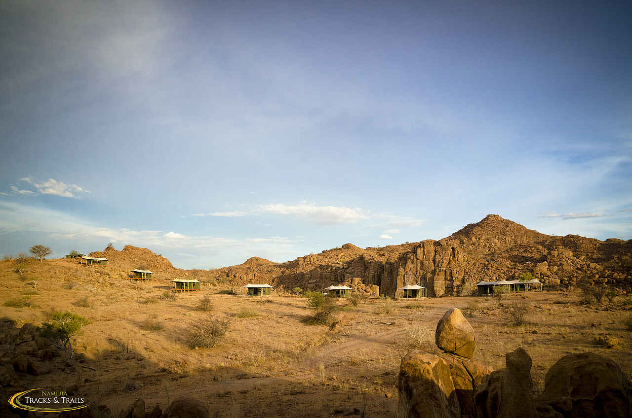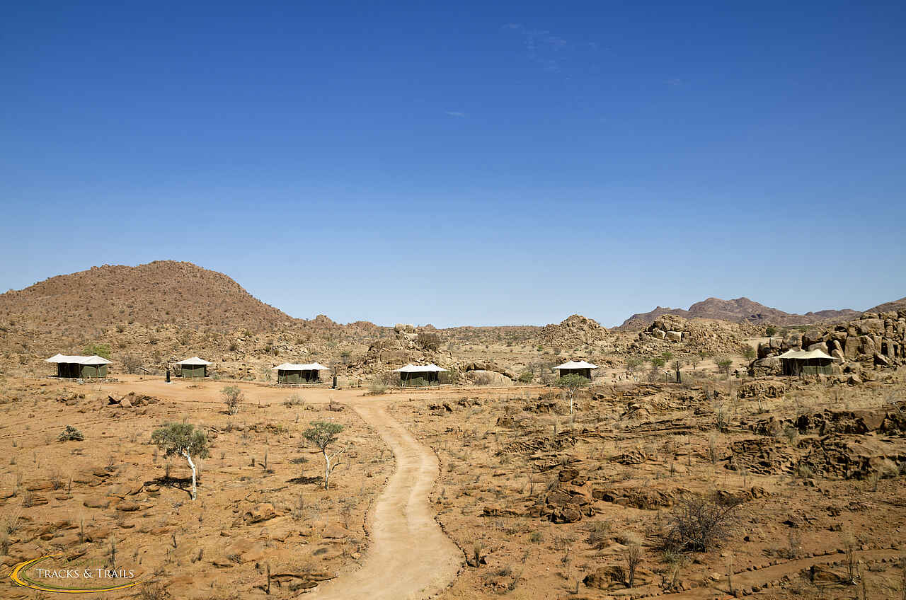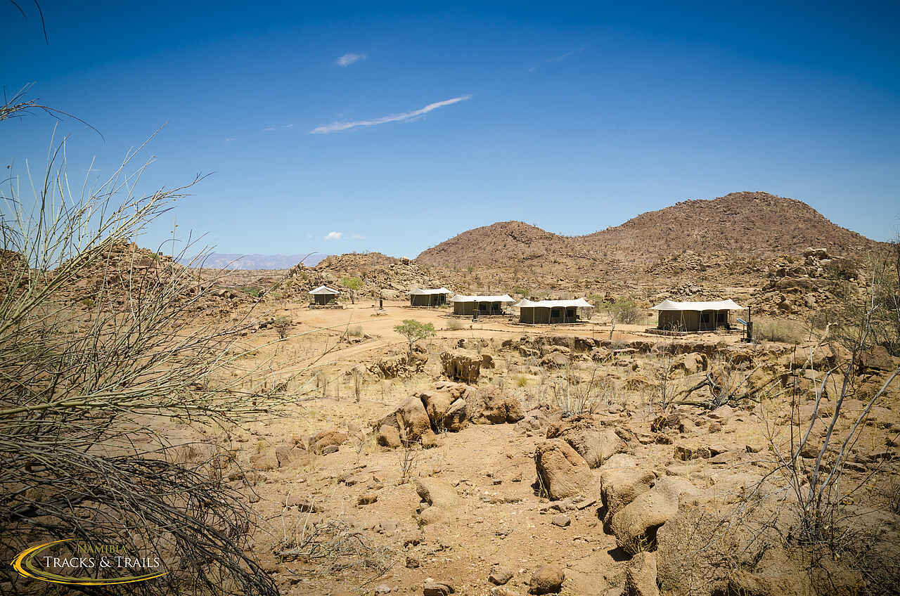 Das Camp bietet einen Panoramablick über den Ugab und dem massiven Brandberg. Als Alternative zu anderen Unterkünften ist man in diesem einerseits rustikalen, aber dennoch komfortablen Zeltlager, der Natur nah. Die Begegnung mit den Wüstenelefanten kann ein wahres Erlebnis sein, wie auch der Besuch bei der lokalen Bevölkerung dieser Gegend.