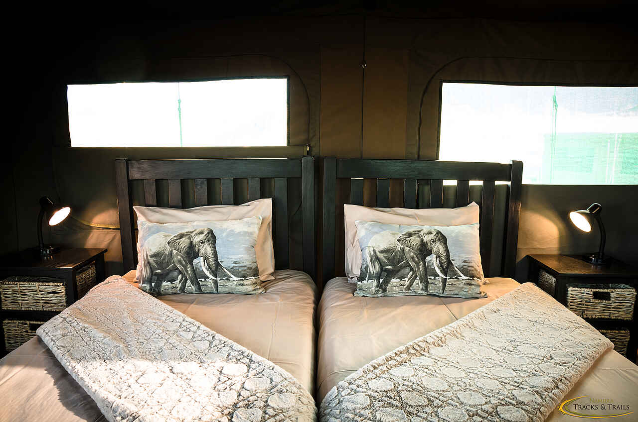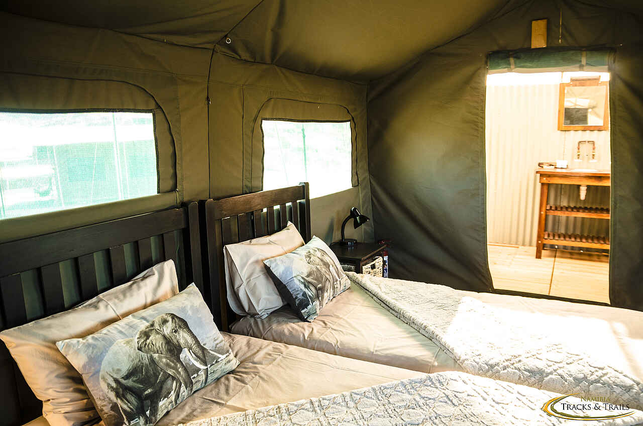 Um die Privatsphäre zu gewährleisten, wurden die Zeltchalets einige Meter versetzt errichtet. Alle 7 Zelte, manche auf einem Betonsockel, andere auf Holzstelzen, verfügen über jeweils 2 Betten und einer Kleiderablage. Fenster aus Moskitonetzen halten unerwünschtes Getier draußen und sorgen für nötige Ventilation. Das en-suite Badezimmer durch eine Zeltplane vom Schlafbereich getrennt, ist mit einer Dusche, einem Waschbecken, Toilette und Ablagemöglichkeiten ausgestattet. Das verlängerte Überzelt ermöglicht ein schattiges Plätzchen mit 2 Stühlen vor dem Eingang des Zeltchalets. Das Familienzelt ist wie die restlichen ausgestattet, bietet jedoch 4 Betten