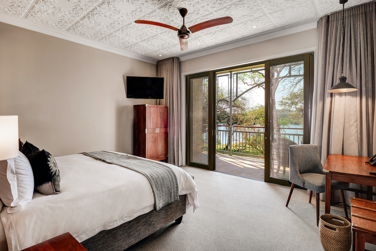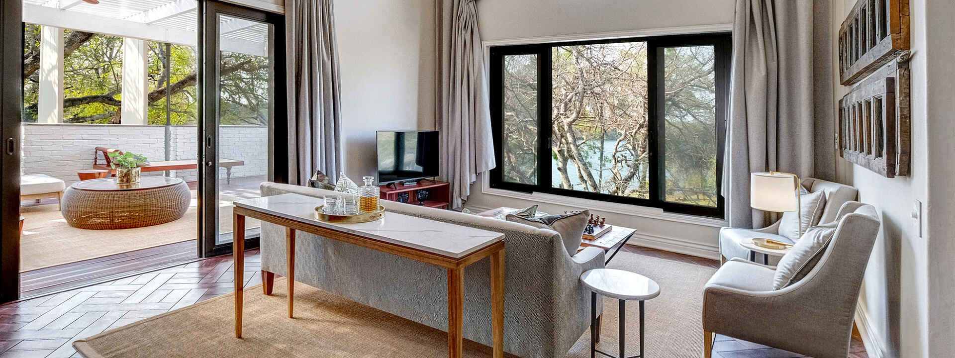 Presidential Suite: Das prächtigste Zimmer des Palm River Hotels liegt im Zentrum der Anlage mit unvergleichlichen Blicken auf den Sambesi-Fluss. Die Präsidentensuite (112 qm) ist ausgestattet mit einem Super-Kingsize-Bett und privatem Mini-Balkon. Des Weiteren gibt es einen zweiten, sehr großen Balkon mit Flussblick. Vom Schlafzimmer aus gelangt man in eine geschmackvolle Lounge. Das Badezimmer verfügt über eine große Badewanne, einen Doppelwaschtisch sowie eine Doppeldusche.