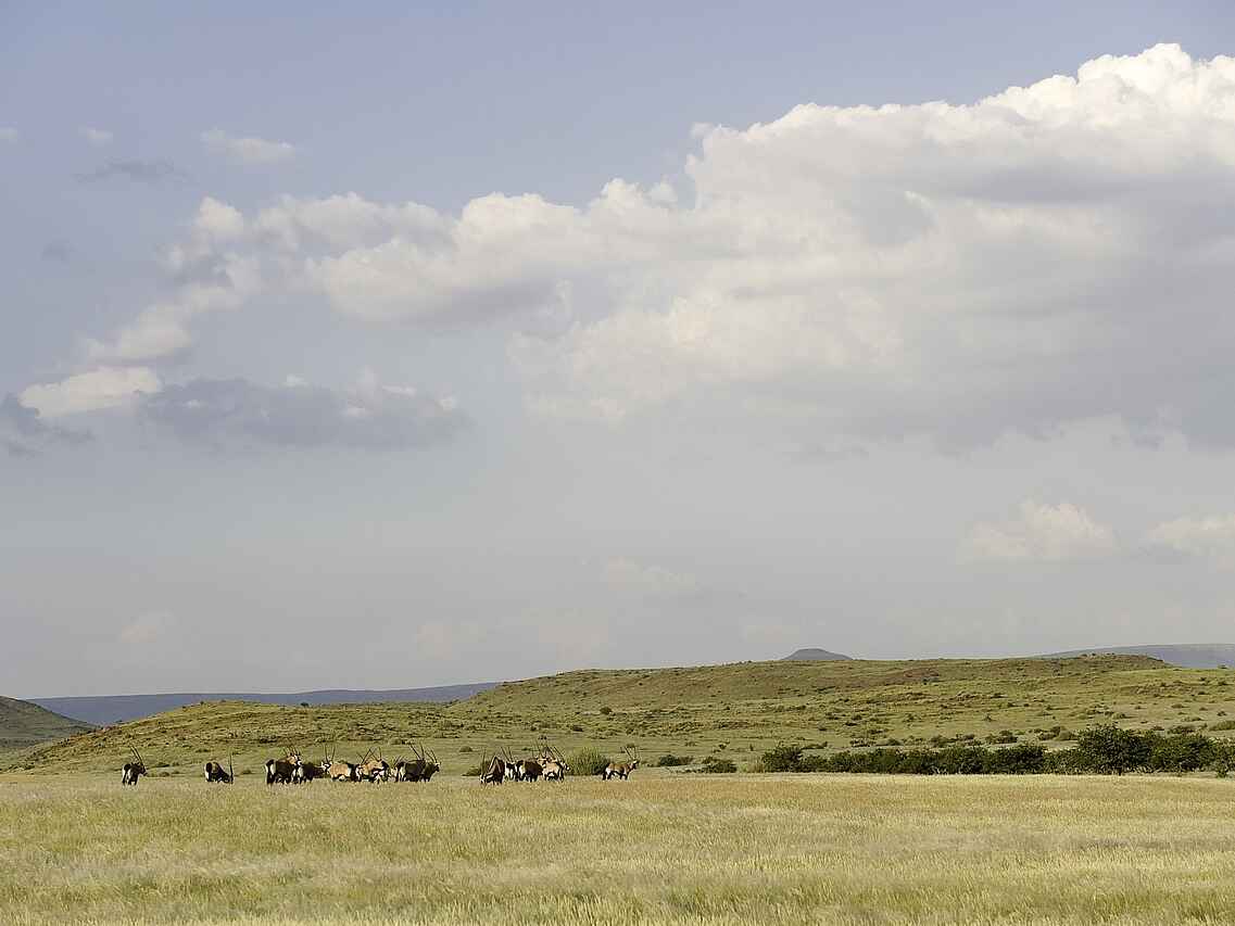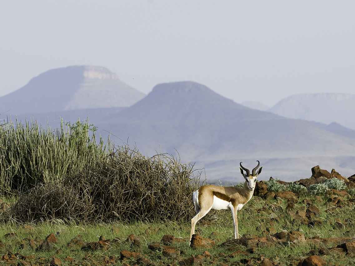 Bergzebras, Antilopen, Springböcke, Kudus, Löwen, Leoparden, Hyänen, Geparden, diverse Vogelarten, Erdmännchen, Spitzmaulnashorn, wahrscheinlich die größte freilebende, nicht durch einen Nationalpark geschützte Population. Wüstenelefanten.