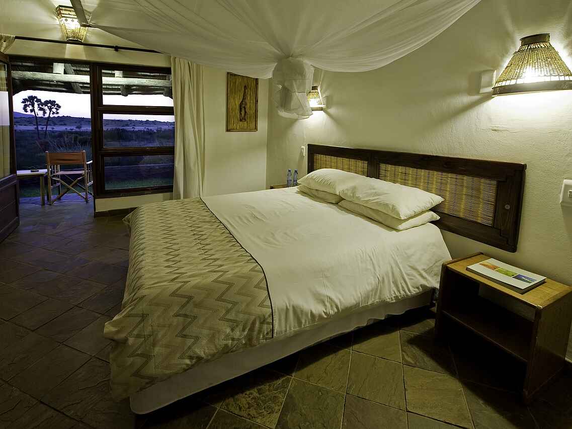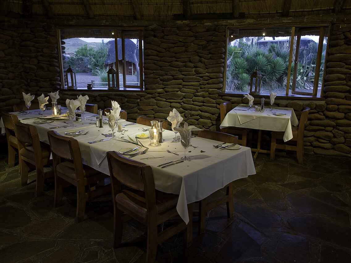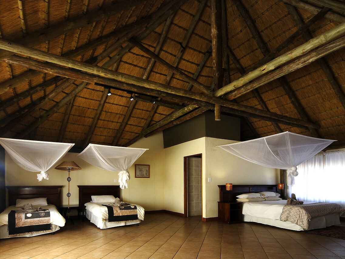 Die Lodge ist im afrikanischen Stil gehalten und bettet sich idyllisch in die Umgebung ein. Neben einem Restaurant, einer Bar und einem Souvenirshop bietet sie auch einen Felsenpool.