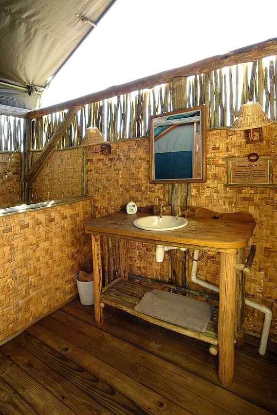 Die weitläufige Anlage umfasst Bungalows, luxuriöse Zelte und Campingplätze: 15 reetgedeckte Bungalows, 2 davon für Familien bis 4 Personen, 5 "Luxus"-Zelte, eins davon also Honeymoon-Suite. Alle Bungalows und Zelte mit privatem Bad, Dusche, Waschbecken, WC, fließend Kalt- und Warmwasser. Auf dem Gelände gibt es außerdem 9 Zeltplätze.