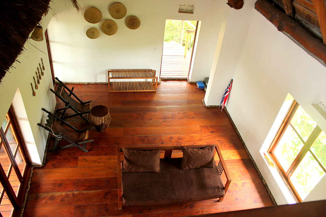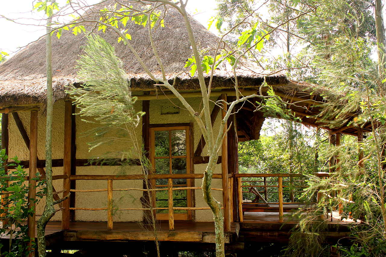 Zu den 9 luxoriösen und geräumige Hütten gelangt man über Steintreppen, die rechts und links vom Hauptgebäude abgehen. Die Cottages wurden im Halbkreis zu beiden Seiten des Haupthauses am erloschenen Vulkankrater errichtet und haben einen wunderbaren Blick auf den Lyantonde See. Jede der 9 Hütten bietet absolute Privatsphäre, versteckt inmitten von Baumkronen und dichten Sträuchern. Acht der Hütten verfügen über zwei Betten (ein Kingsize-und ein Einzelbett), lokale Steinen verzierten Badezimmer mit Dusche, WC und Waschbecken, einem Ankleidezimmer mit großem Spiegel und einer Veranda mit Liegestühlen und einer Hängematte. Die neunte Hütte ist eine zweistöckige Villa mit drei Schlafzimmern, einem Kamin im Wohnzimmer, einem geräumigen Badezimmer und einer großen Terrasse. Ruhige Farben, subtile Accessoires, originelle Innenarchitektur, einfache, aber bequeme Möbel zeichen die Cottages der Papaya Lake Lodge aus.