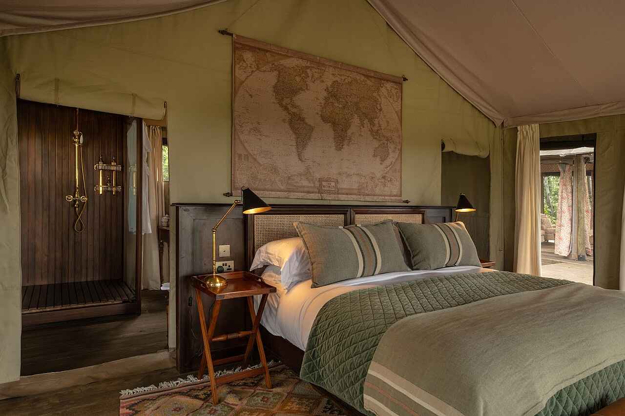 Die Gästeunterkünfte des Paradise Plains Camp sind großzügig gestaltete Zeltsuiten-Ensembles, die deutlich mehr Raum bieten als klassische Safarizelte. Jede Einheit besteht aus drei Zelten auf einer gemeinsamen Plattform und schafft ein komfortables Wohngefühl mitten in der Savanne. Die Hauptsuite beherbergt den Schlafbereich mit einem komfortablen Doppelbett und Moskitonetz. Große Fensterflächen lassen viel Tageslicht in die Räume und geben den Blick über die Ebenen der Masai Mara frei.