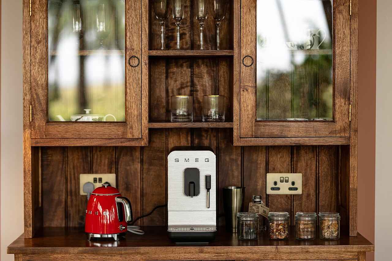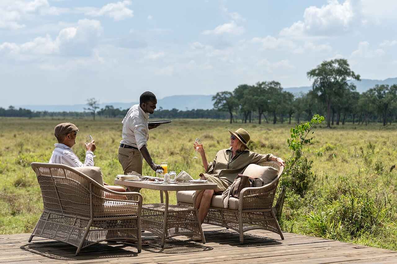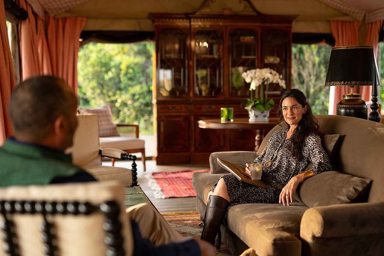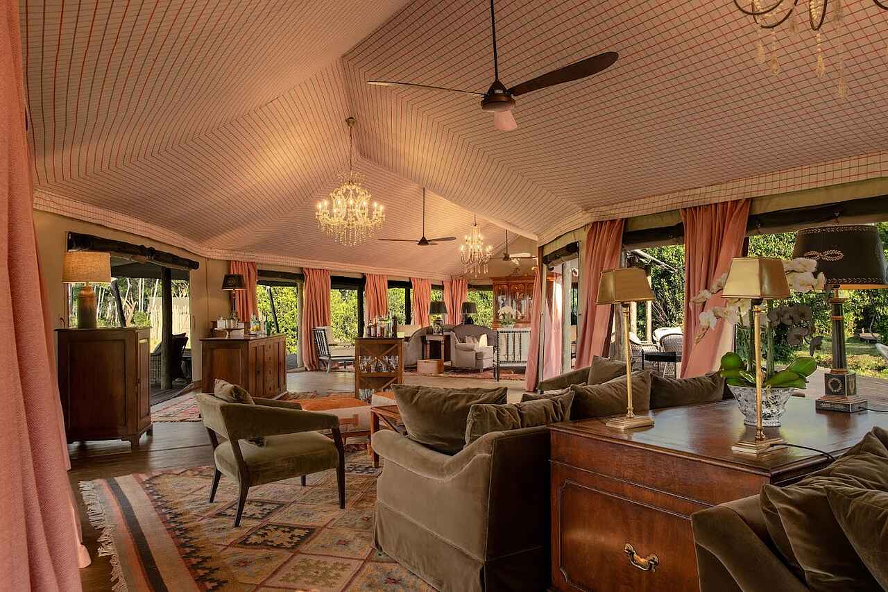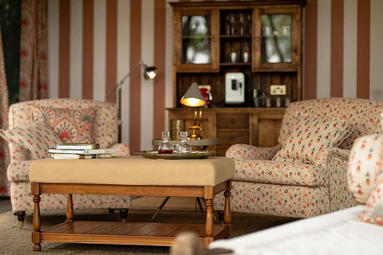 Ein zweites Zelt ist als zusätzliches En-suite-Badezimmer gestaltet und verfügt über eine freistehende Badewanne. Das dritte Zelt dient als separater Wohnbereich mit bequemen Sitzmöbeln und viel Platz zum Entspannen. Zur Ausstattung gehören außerdem eine Minibar, Kaffee- und Teezubereitungsmöglichkeiten, Ferngläser, WLAN sowie Bücher und Spiele. Eine private Veranda ergänzt die Unterkunft und bietet einen angenehmen Platz, um die Eindrücke eines Safaritages ausklingen zu lassen.