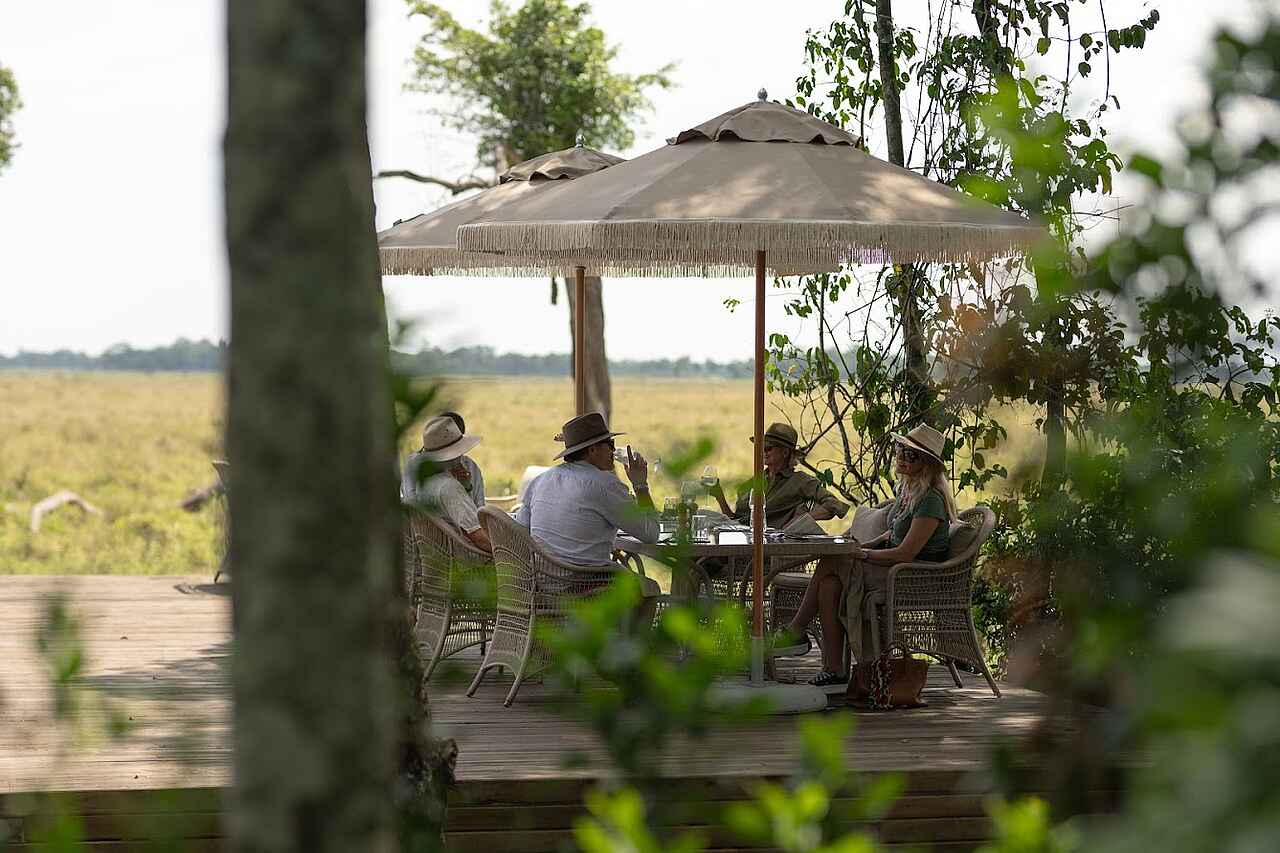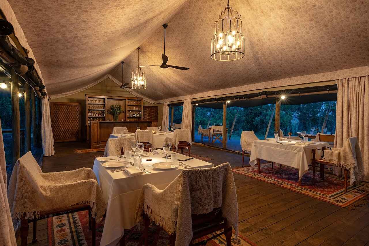 Die Mahlzeiten werden im offenen Speisebereich des Camps oder je nach Wetter unter freiem Himmel serviert. Der Tag beginnt mit Kaffee oder Tee vor der morgendlichen Pirschfahrt, danach folgt ein ausgiebiges Frühstück. Mittags werden leichte Gerichte angeboten, während das Abendessen als mehrgängiges Menü gestaltet ist. Lokale Zutaten und frische Produkte spielen eine wichtige Rolle in der Küche des Camps. Alle Mahlzeiten und Getränke (außer Premium-Alkoholika) sind inklusive. Besondere Ernährungsbedürfnisse werden auf Anfrage gerne berücksichtigt.