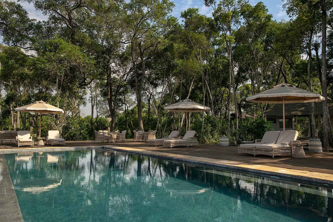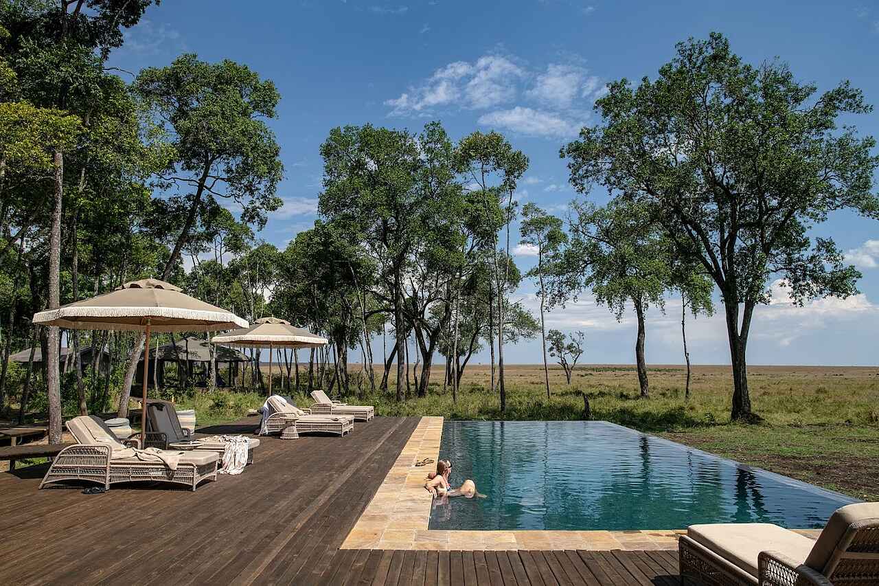 Der zentrale Bereich des Paradise Plains Camp bildet den lebendigen Treffpunkt des Safaricamps. Die offen gestaltete Lounge, Bar und der Essbereich liegen unter einem großzügigen Dach und öffnen sich zur Savannenlandschaft der Masai Mara. Bequeme Sitzgruppen laden dazu ein, zwischen den Pirschfahrten zur Ruhe zu kommen und den Blick über die Ebenen schweifen zu lassen. Die Bar serviert eine Auswahl an Weinen, Spirituosen und Erfrischungen, während der Pool an warmen Tagen für eine willkommene Abkühlung sorgt. Für aktive Gäste steht außerdem ein kleines Fitnessstudio zur Verfügung. Ein Wellnessbereich bietet zusätzlich Raum für entspannte Momente nach erlebnisreichen Safariaktivitäten.